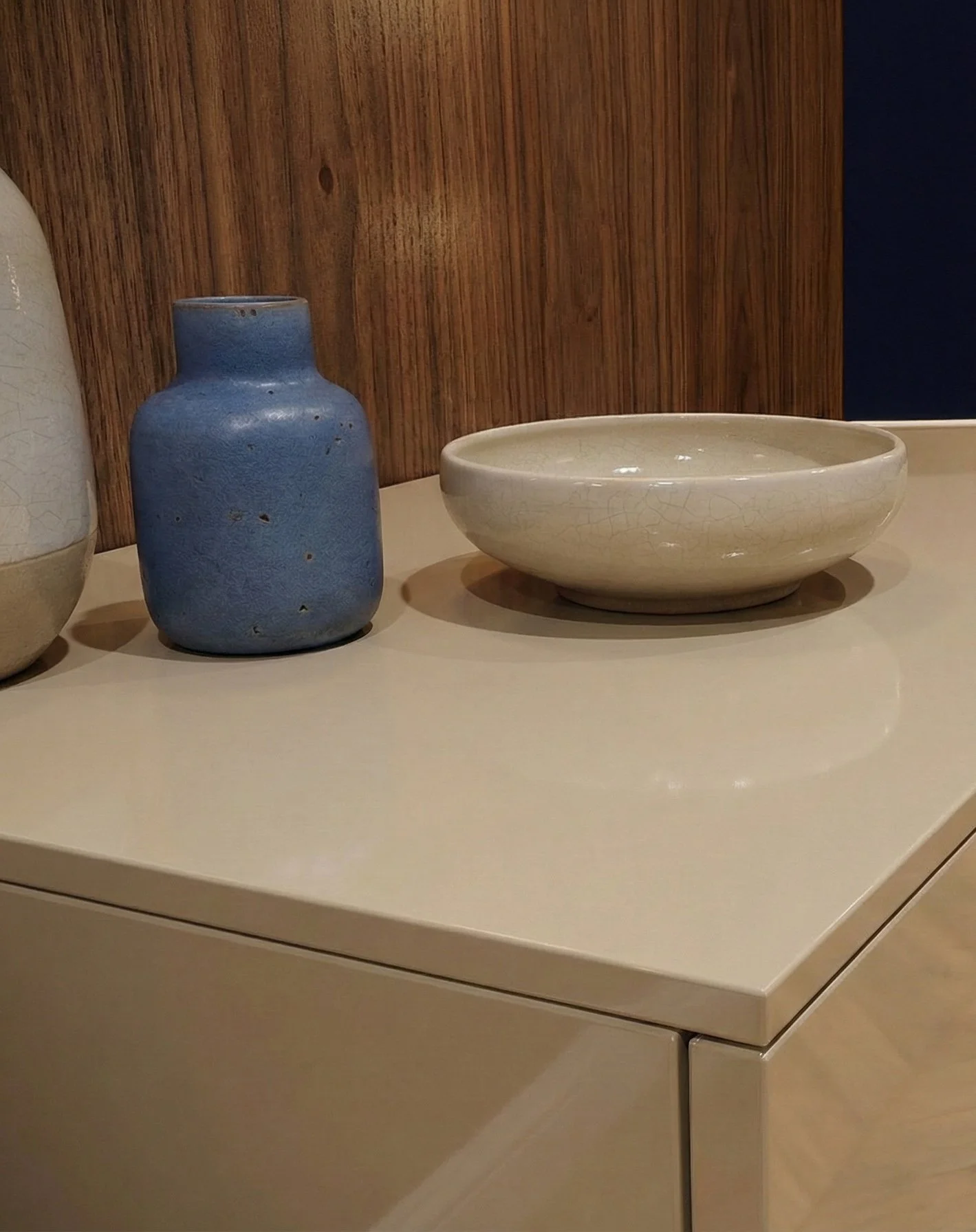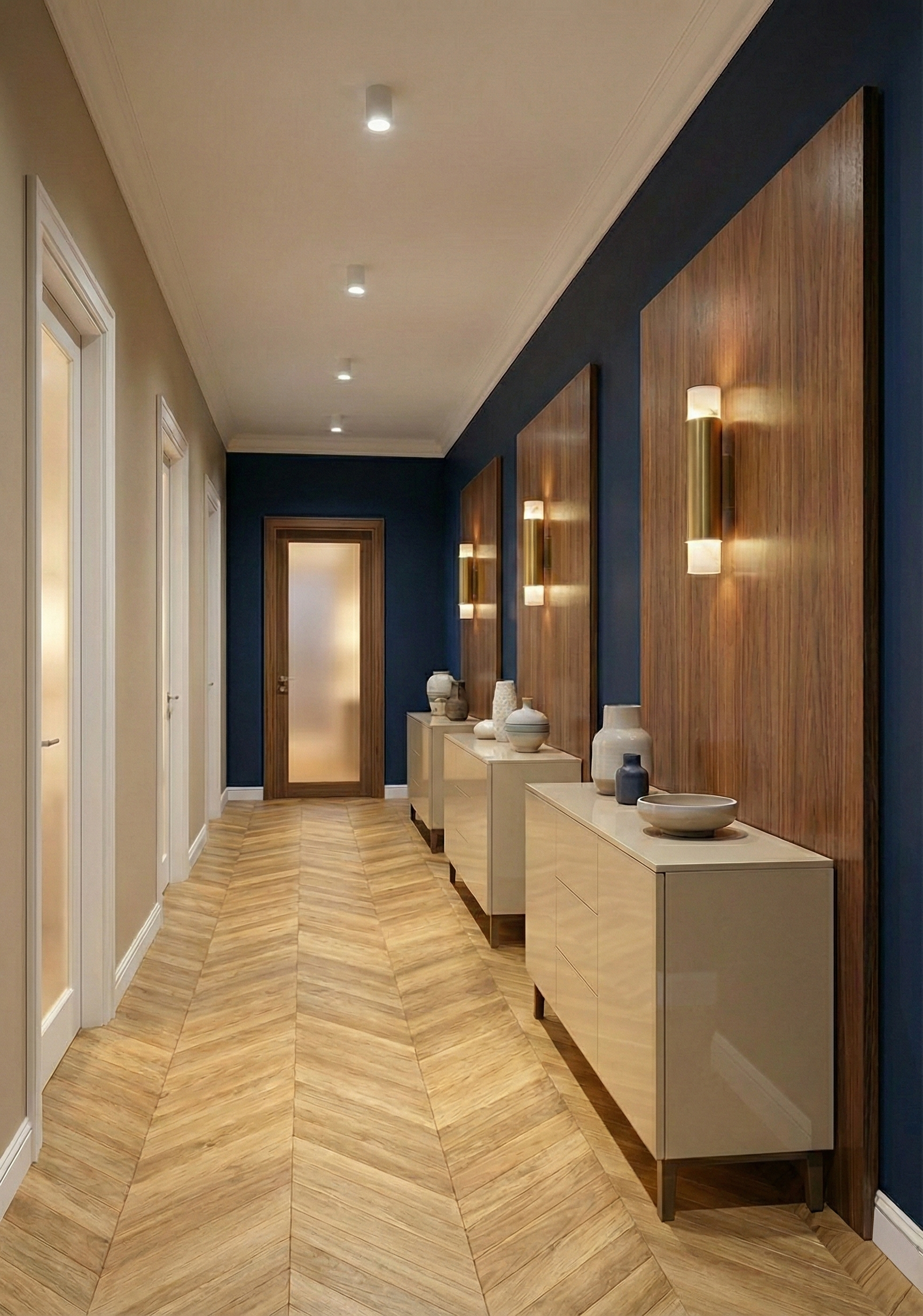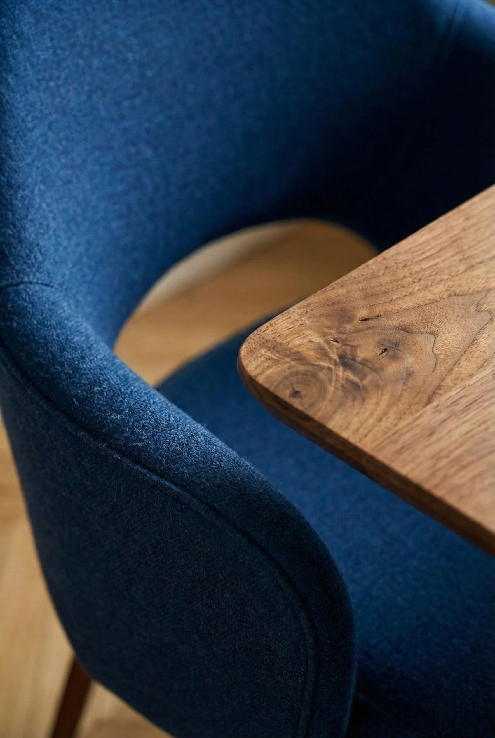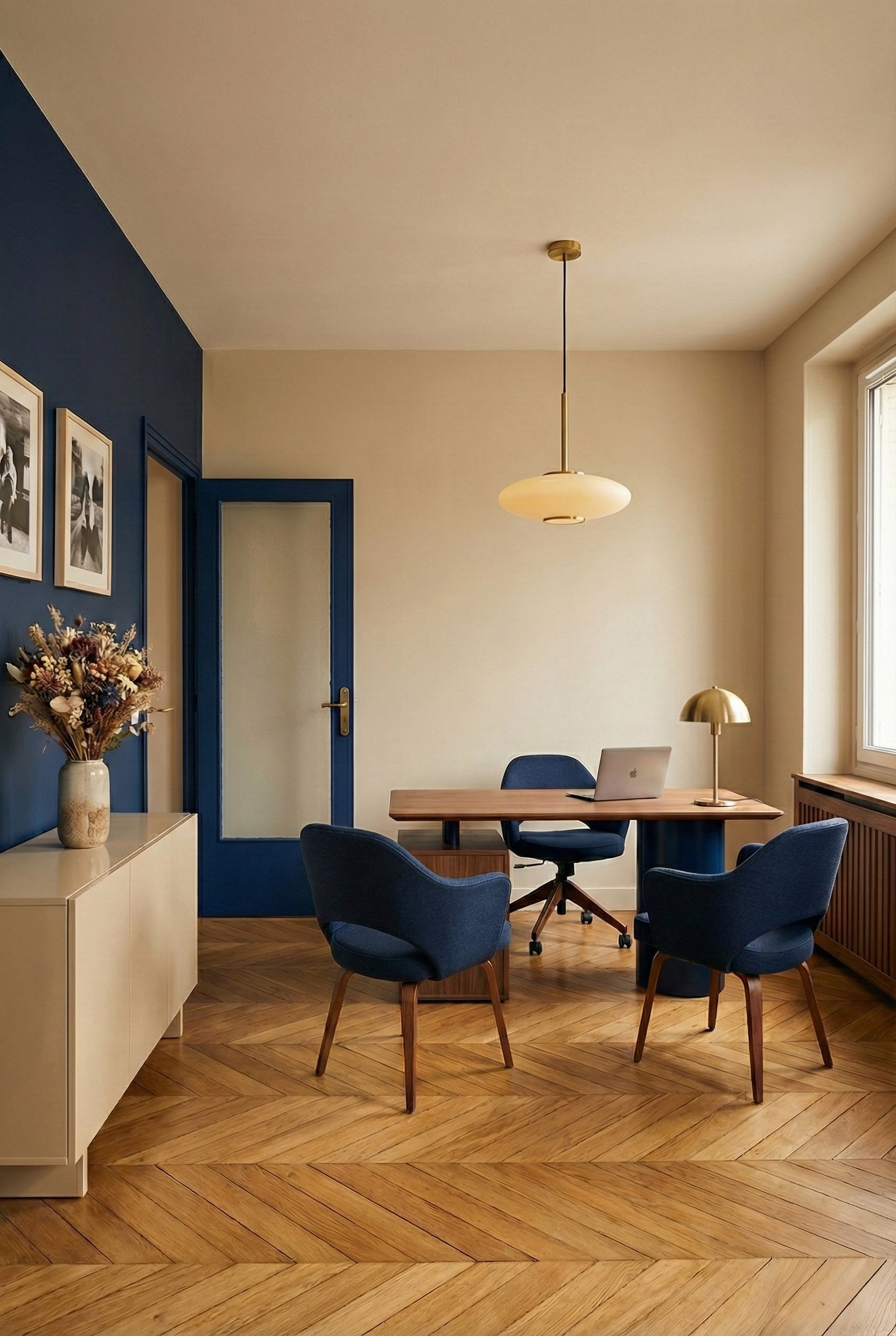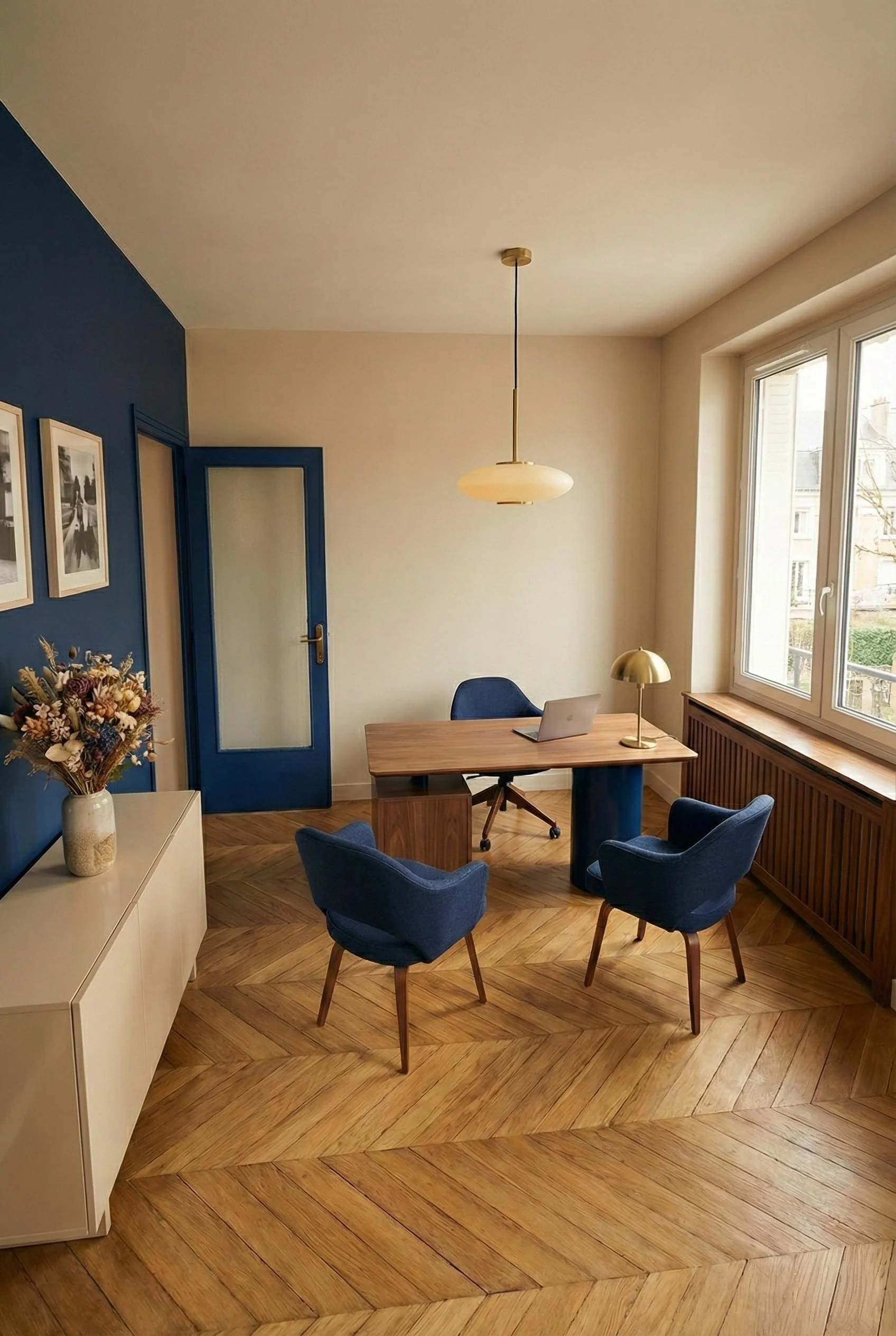 L’espace s'articule autour d’un contraste chromatique puissant et apaisant. Le bleu marine, symbole de confiance et de profondeur, structure les volumes, tandis que le beige apporte une clarté douce et une respiration nécessaire aux espaces de conseil. Cette base sobre est sublimée par l’introduction de matières chaleureuses et statutaires, transformant le cabinet en un véritable lieu d’exception