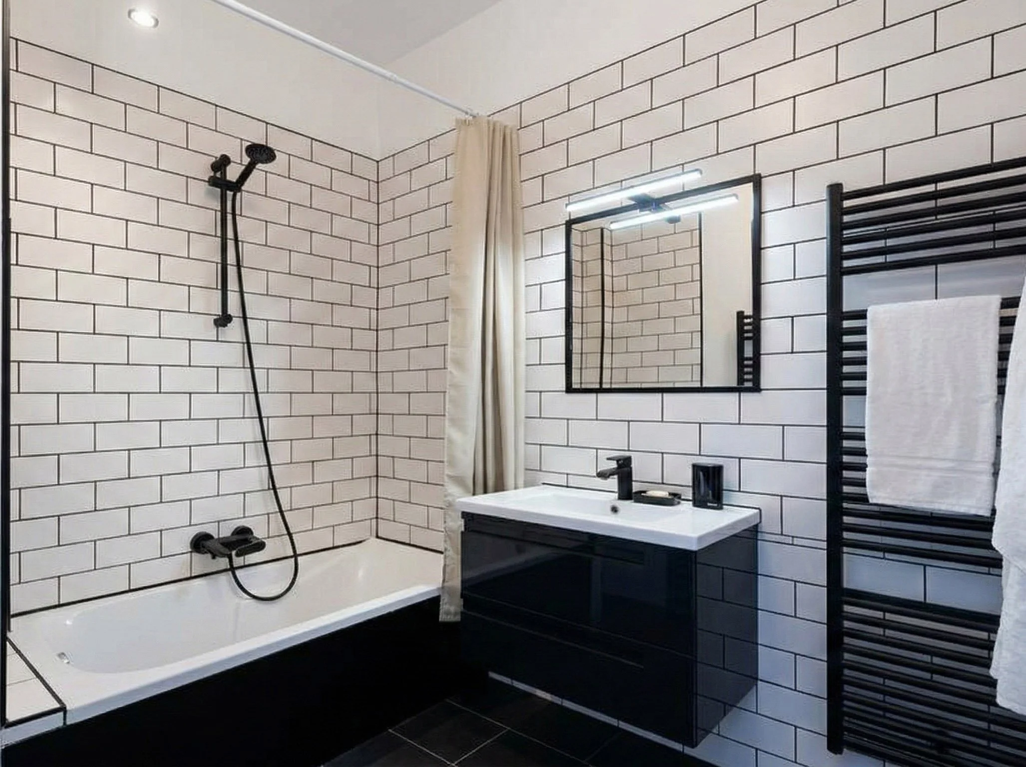 En contrepoint de cette symphonie colorée, la salle de bain mise sur la radicalité du noir et blanc. Un graphisme pur qui vient clore ce voyage avec élégance et modernité.