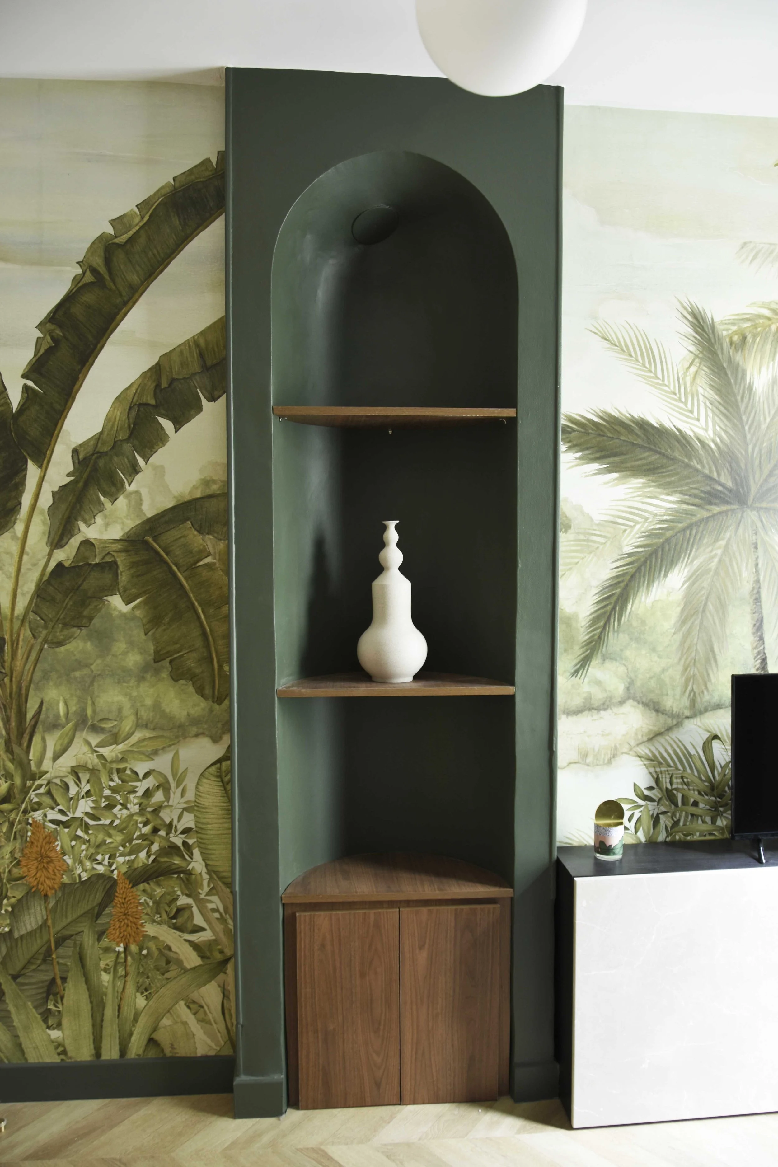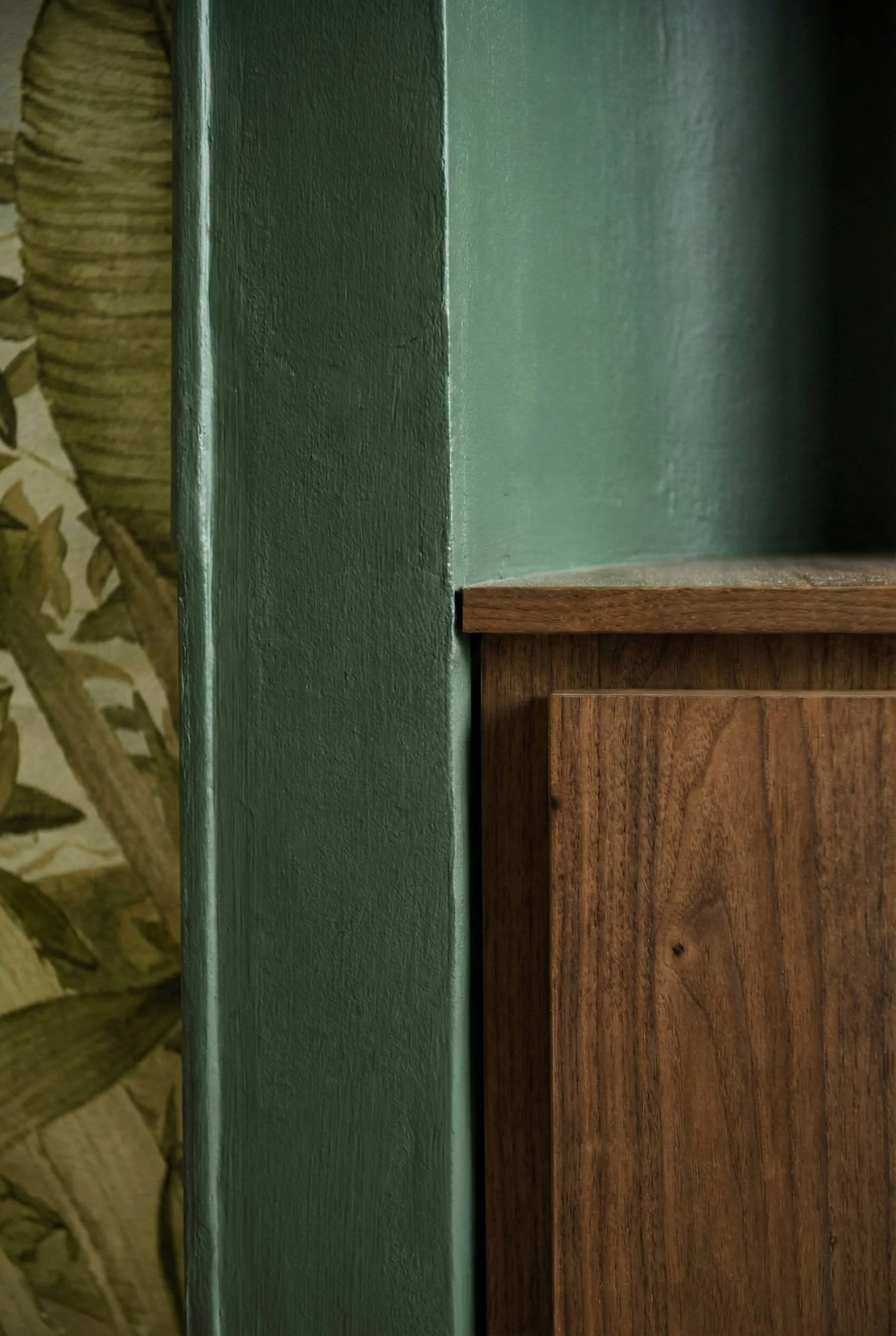 Le décor, lui, raconte une terre lointaine. Les murs se parent de verts profonds et d'ocres brûlants, une palette organique qui évoque une nature généreuse et solaire. C’est un dialogue tactile entre les éléments : la pierre, brute et immuable, vient s'adosser à la chaleur du bois veiné.