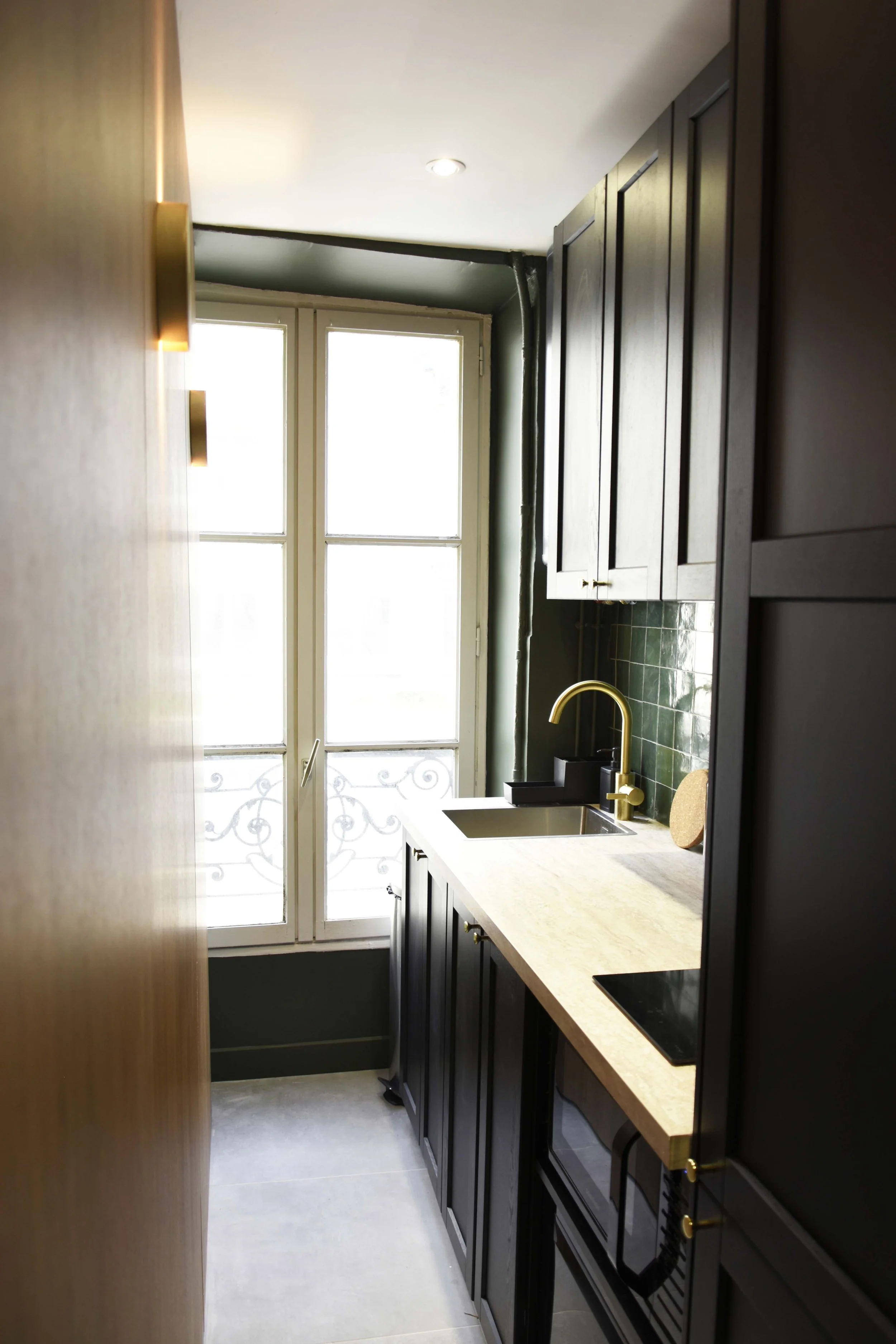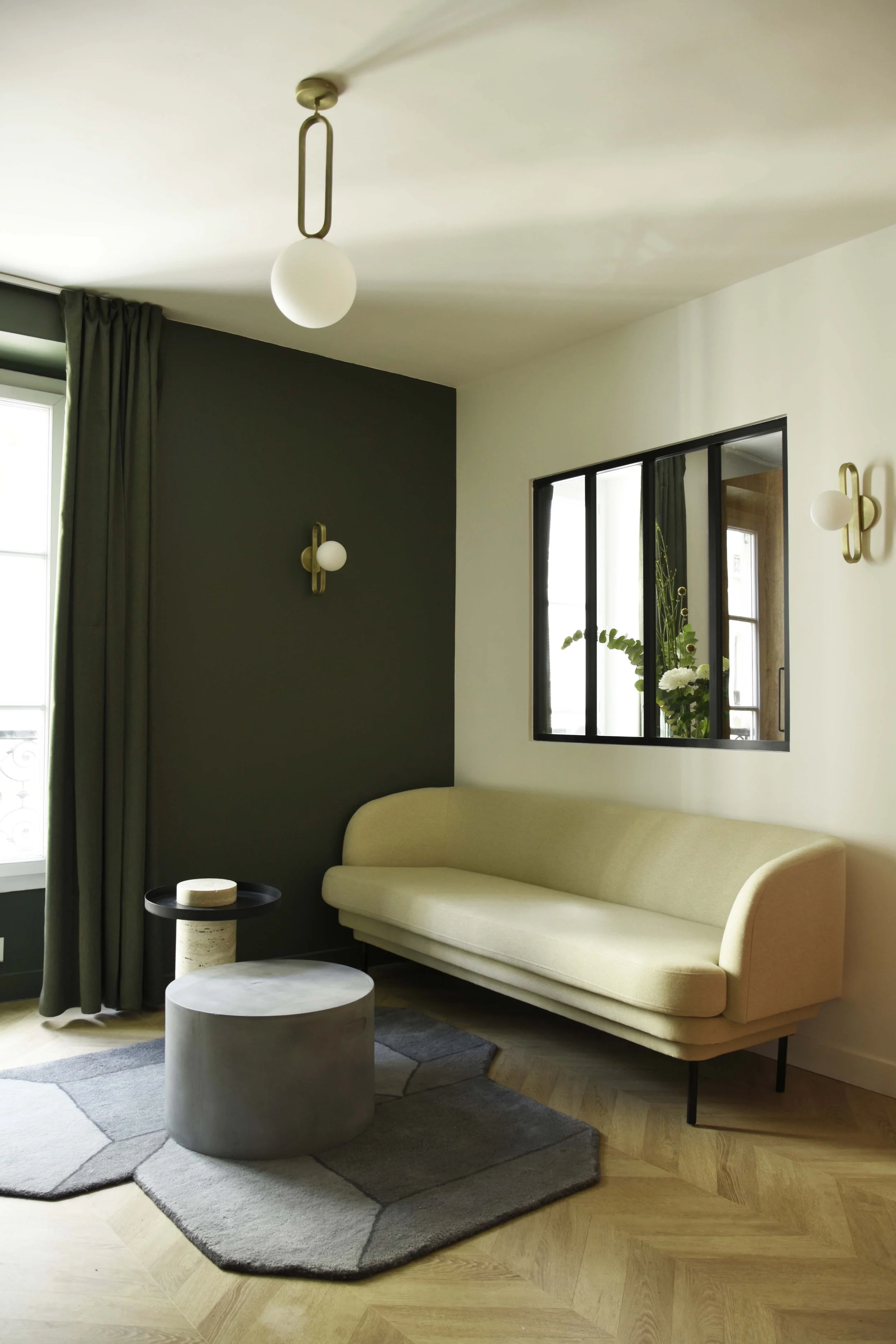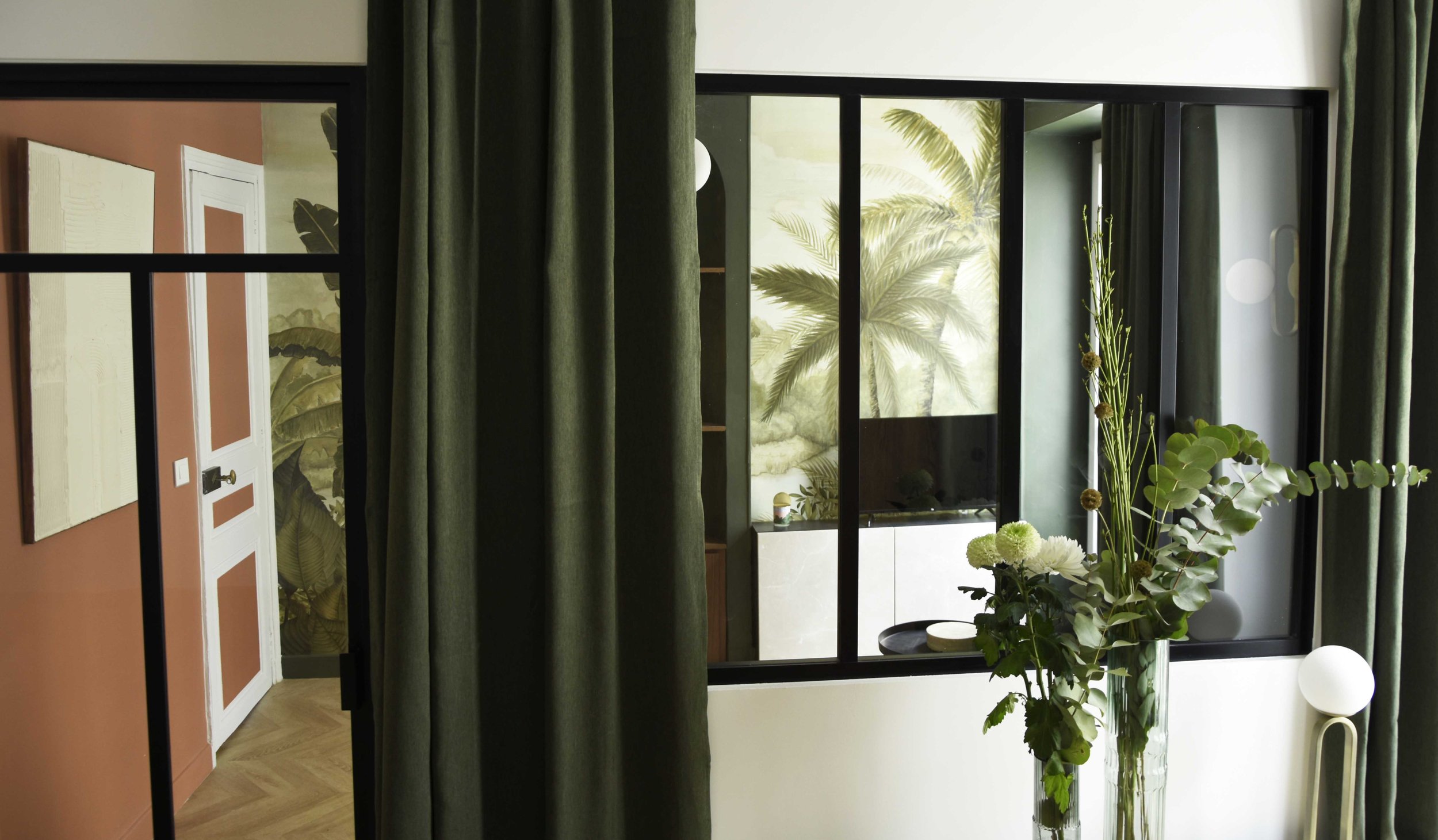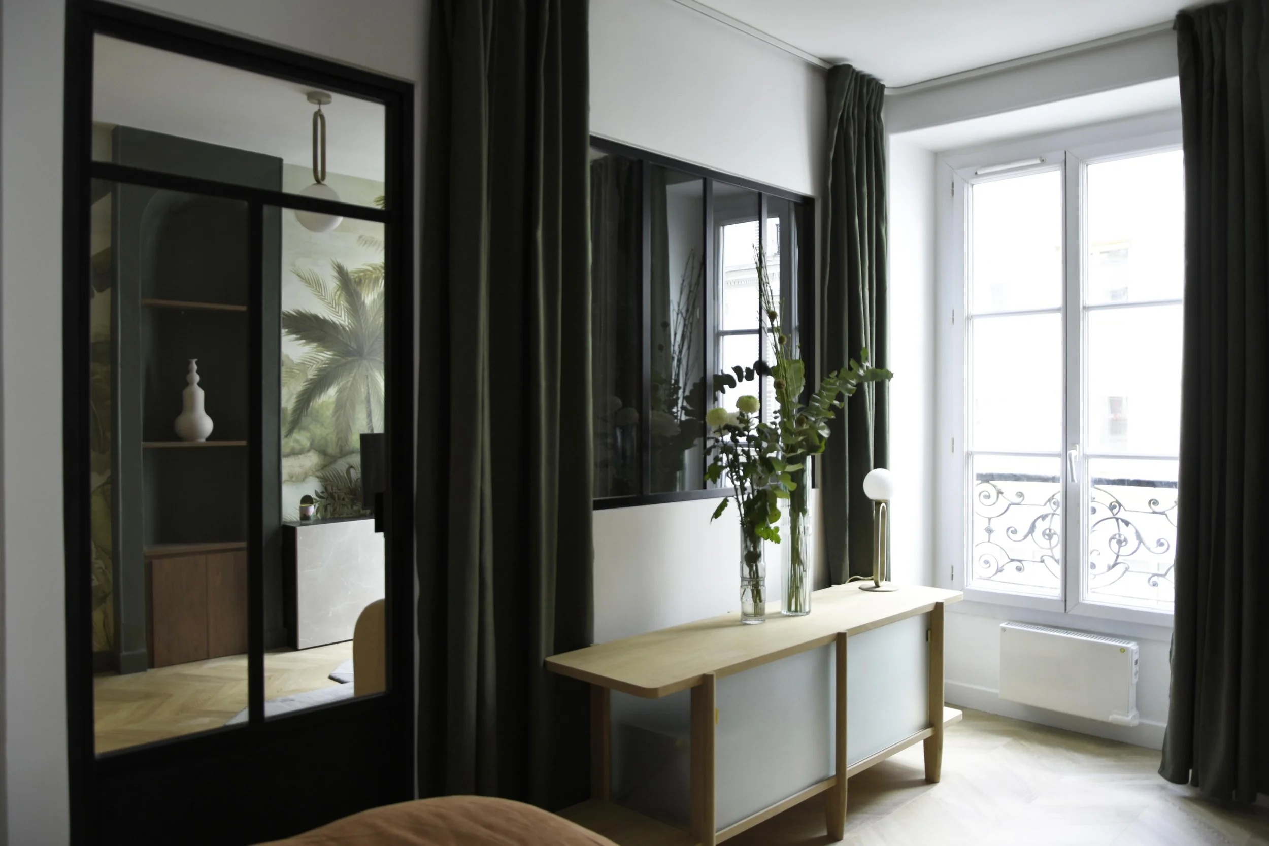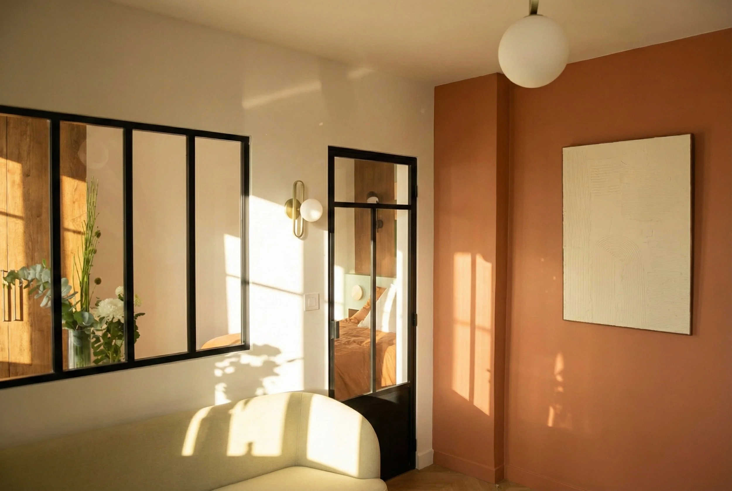 Tout n'est qu'une question de regard. Grâce à un jeu de verrières ciselées, la lumière ne s'arrête jamais ; elle circule, rebondit et traverse l'appartement de part en part. Chaque angle offre une vue dérobée sur la pièce voisine, brisant les cloisons pour ne laisser que la fluidité.
