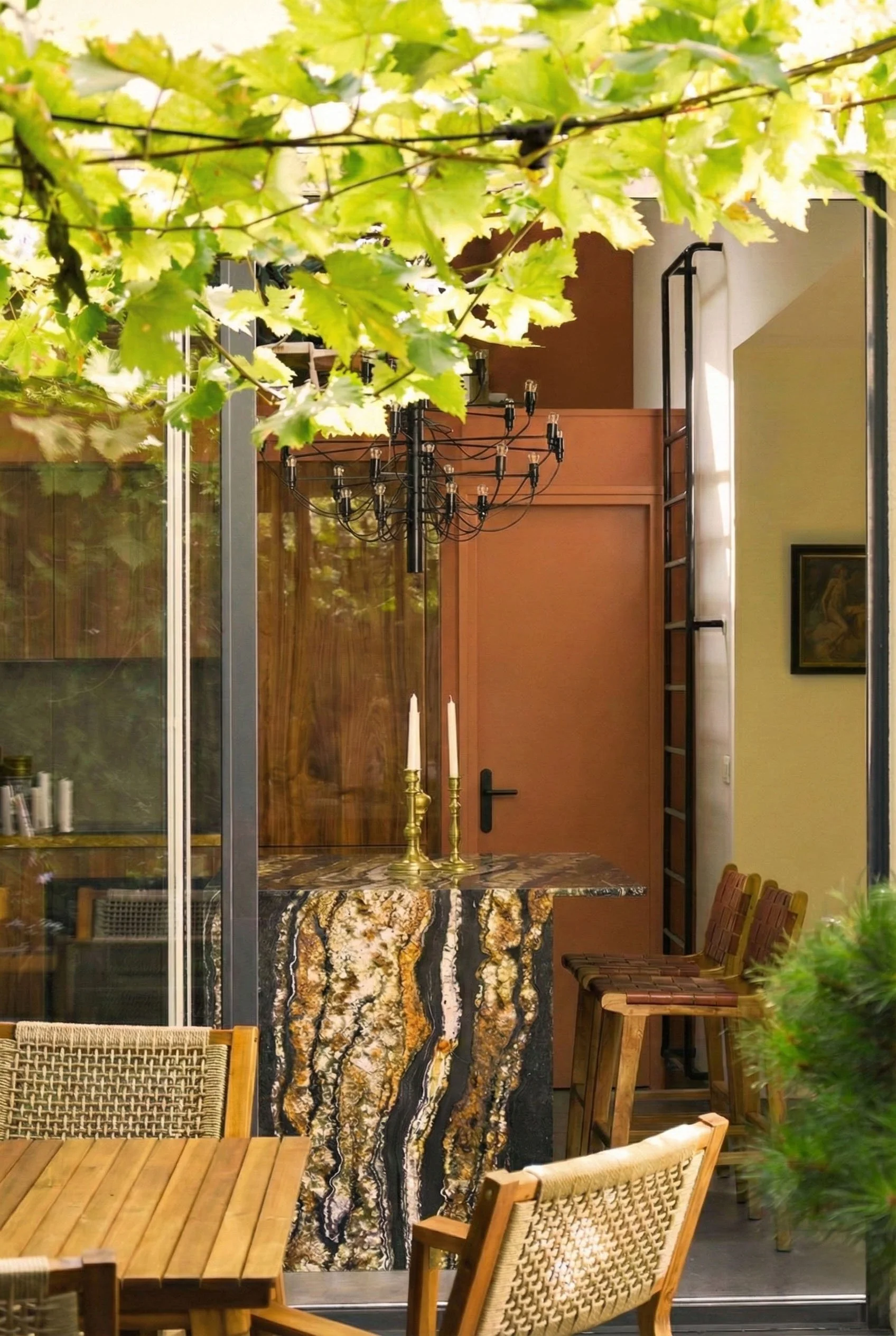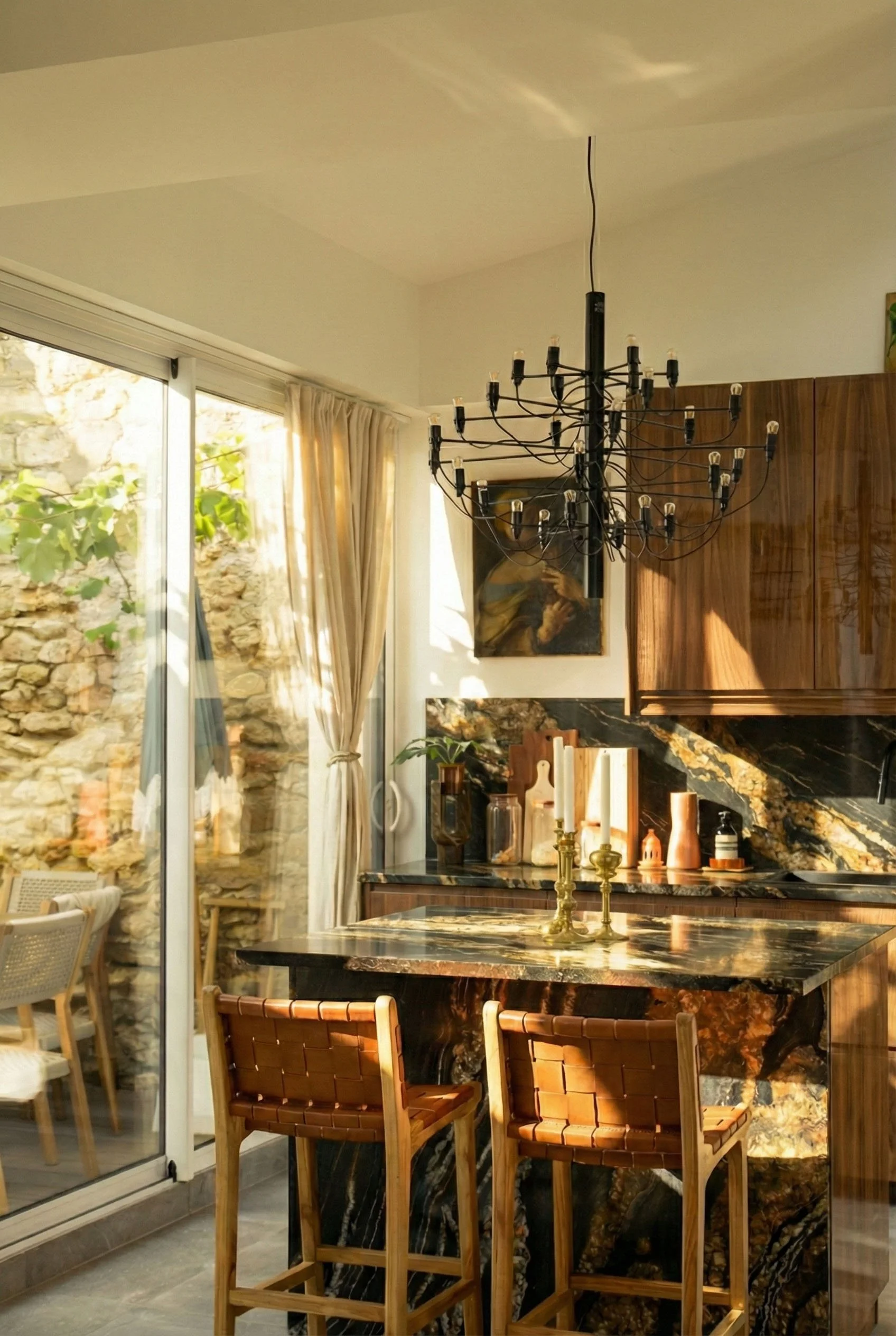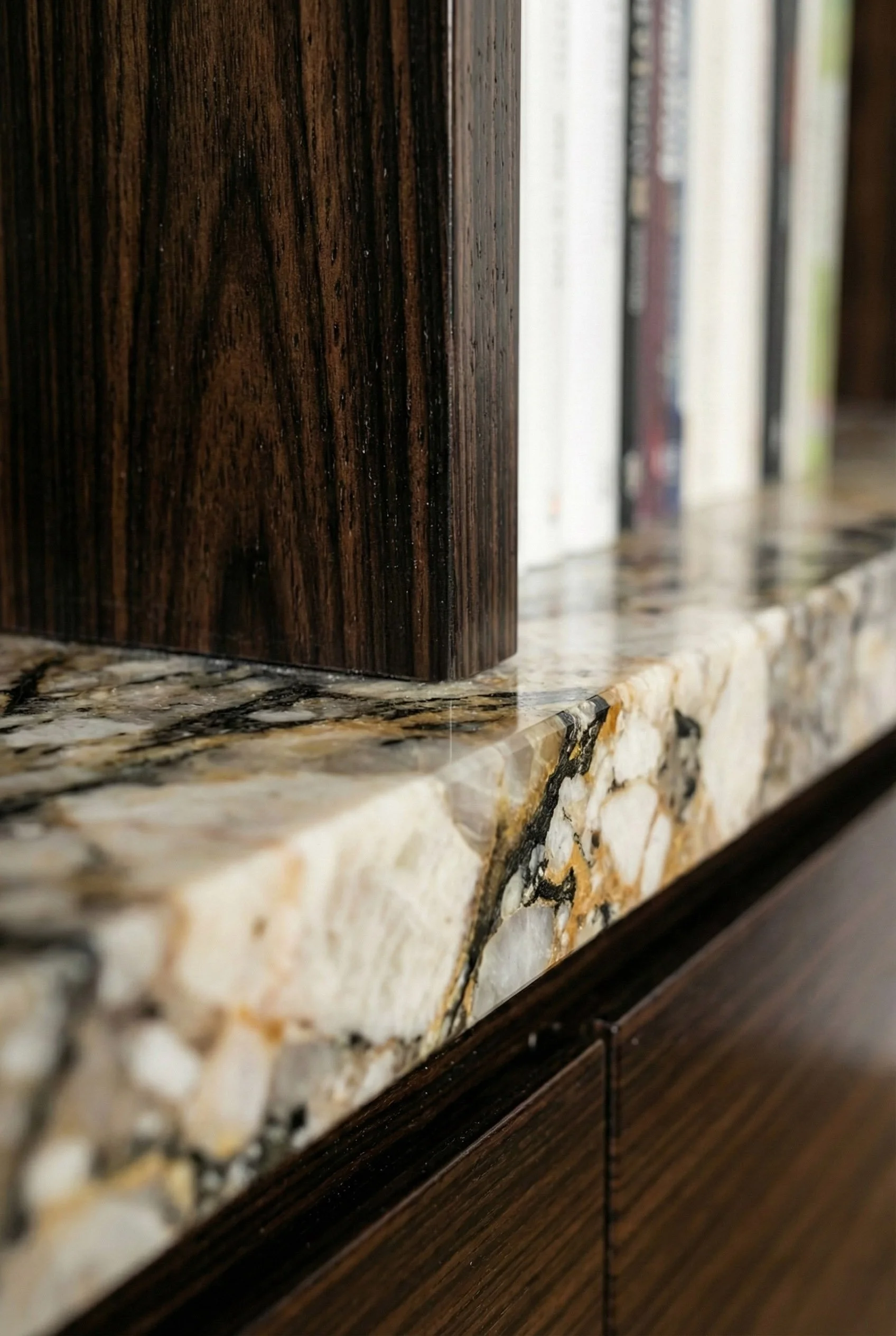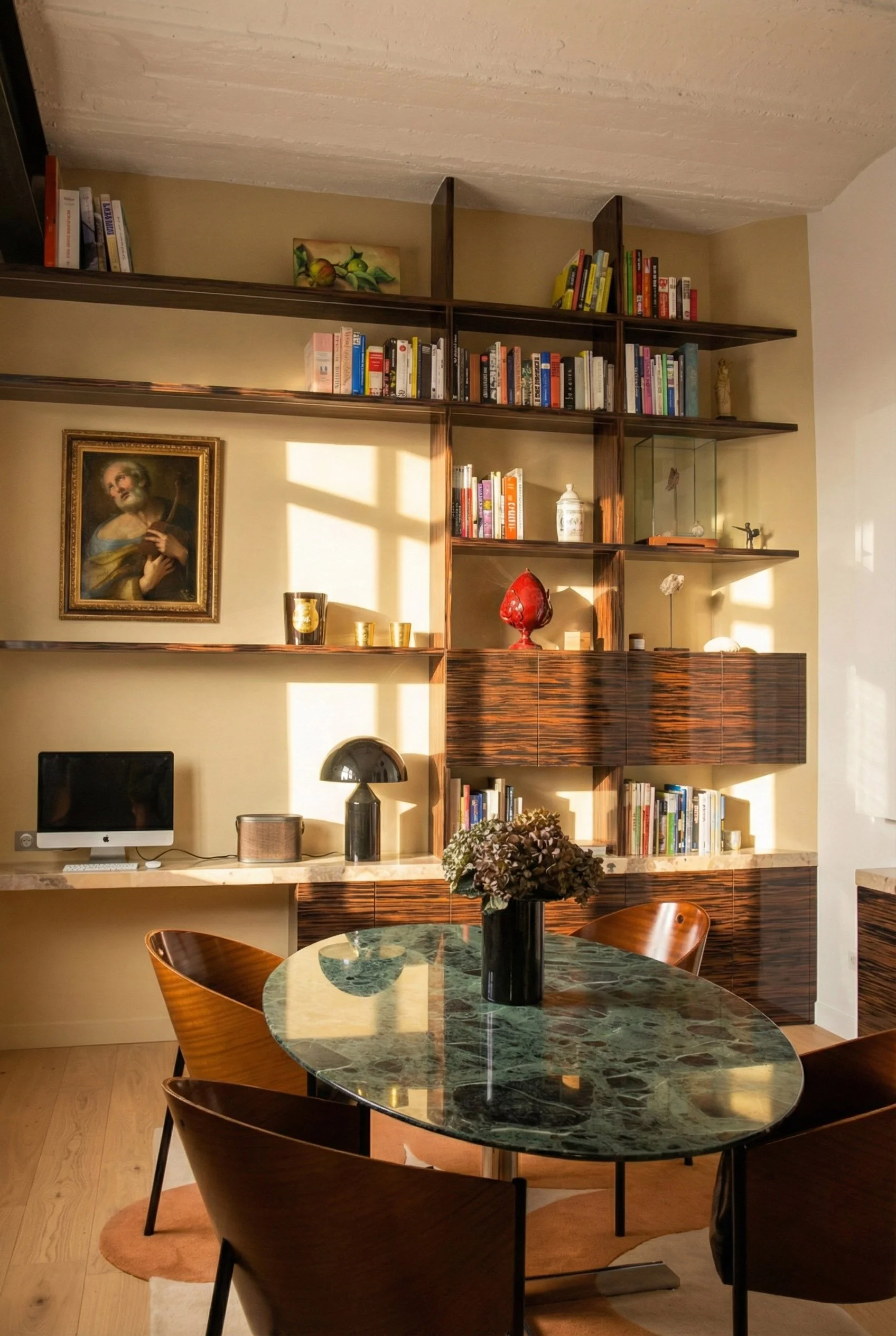 Le mobilier, dessiné sur mesure, vient ancrer ce décor aérien. Une bibliothèque monumentale en ébène s’érige contre les murs, ponctuée par la transparence cristalline du marbre Patagonia. Dans la cuisine, le contraste se fait plus charnel : la chaleur d'un bois verni rencontre la force tellurique d'un îlot en marbre Black Fusion, dont les veines semblent répondre aux reflets du canal tout proche.