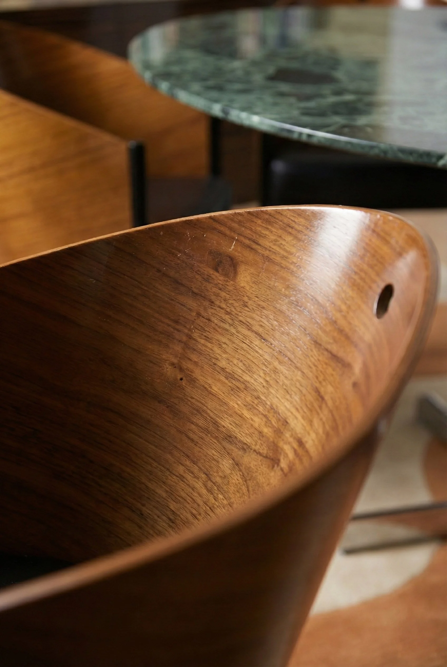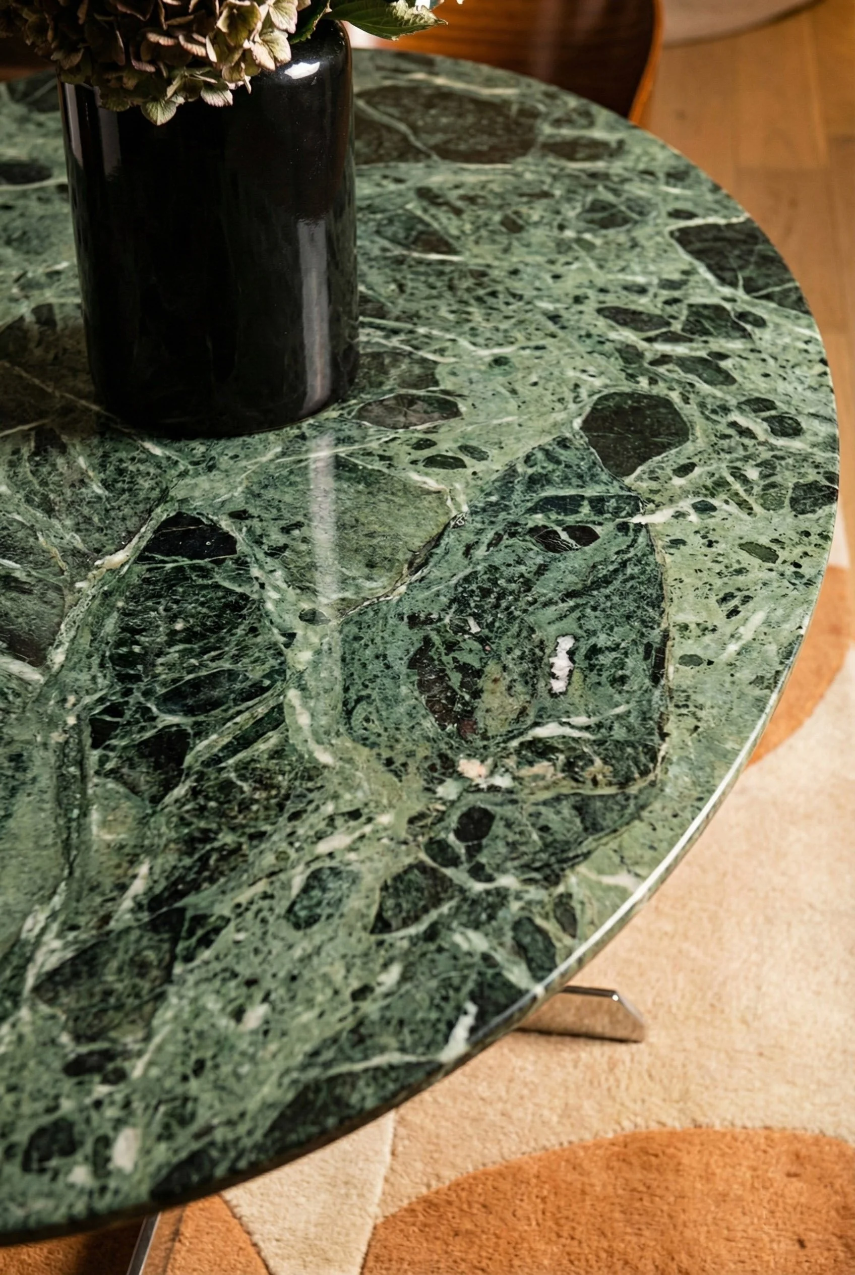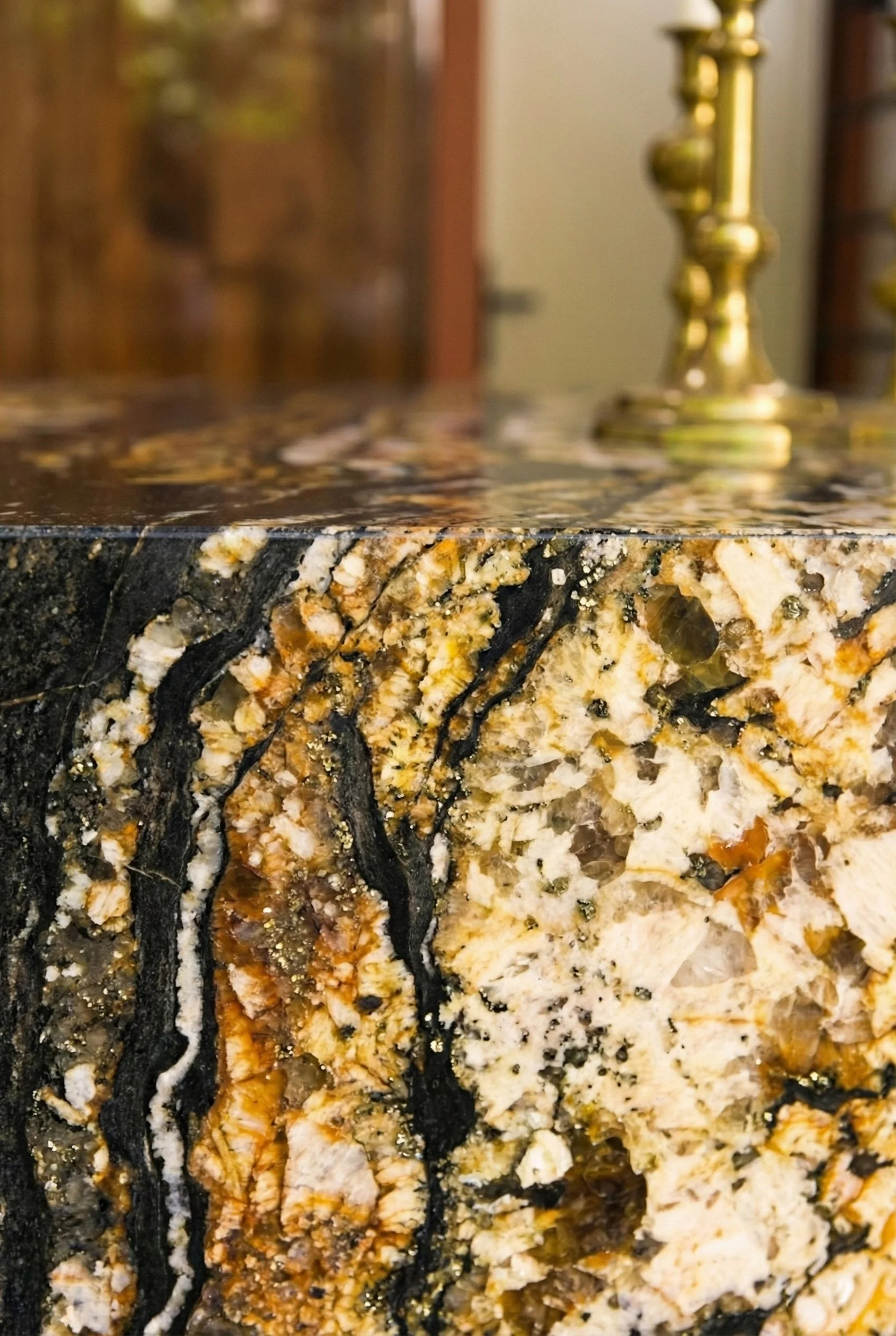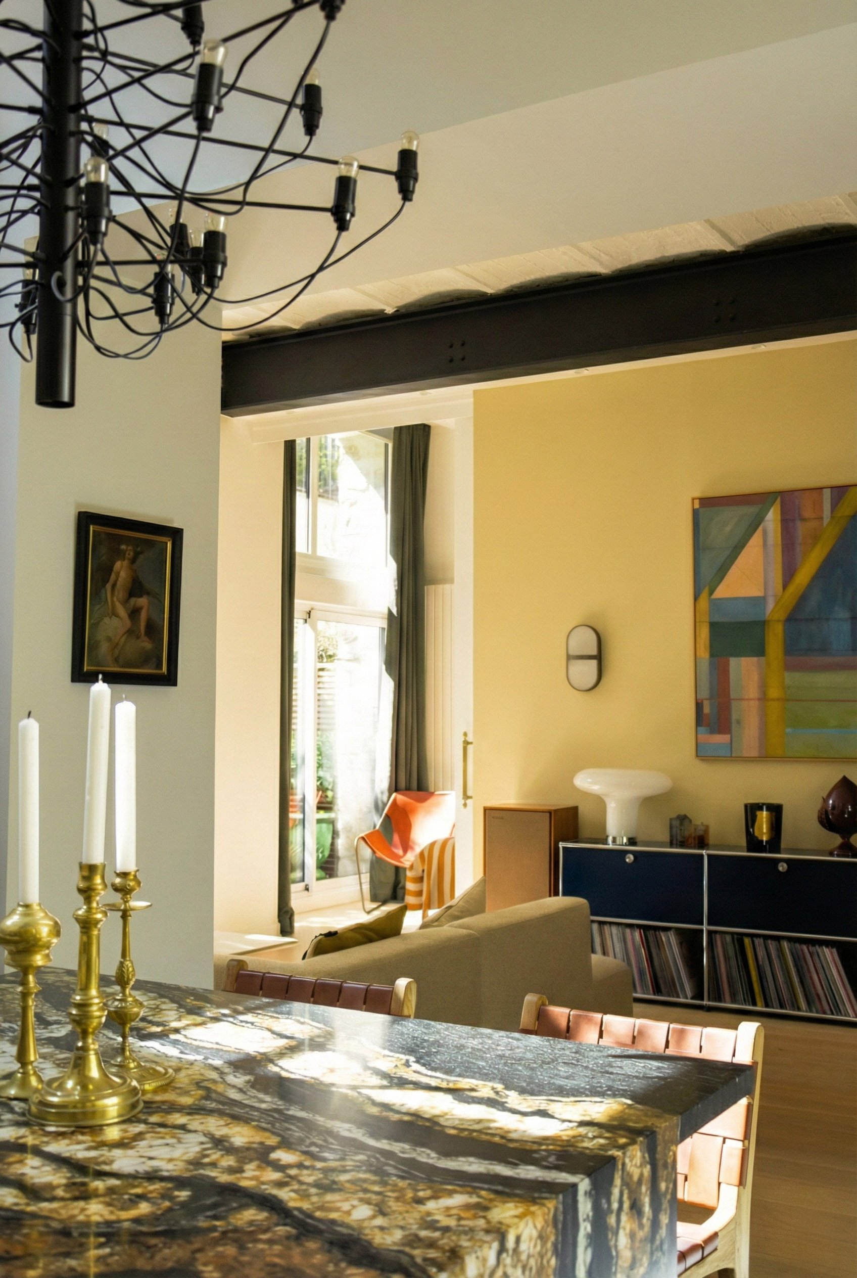 Le mobilier, dessiné sur mesure, vient ancrer ce décor aérien. Une bibliothèque monumentale en ébène s’érige contre les murs, ponctuée par la transparence cristalline du marbre Patagonia. Dans la cuisine, le contraste se fait plus charnel : la chaleur d'un bois verni rencontre la force tellurique d'un îlot en marbre Black Fusion, dont les veines semblent répondre aux reflets du canal tout proche.