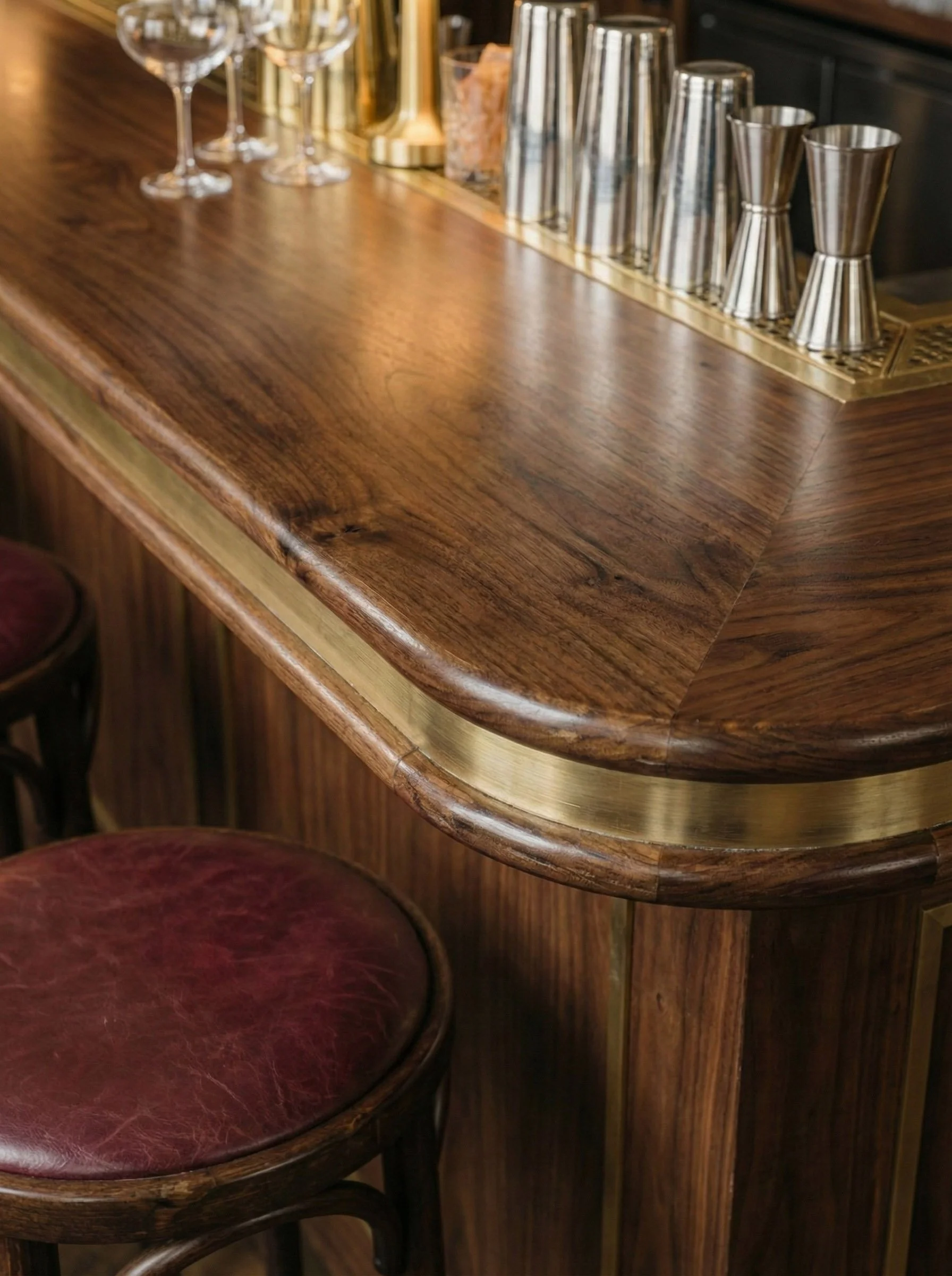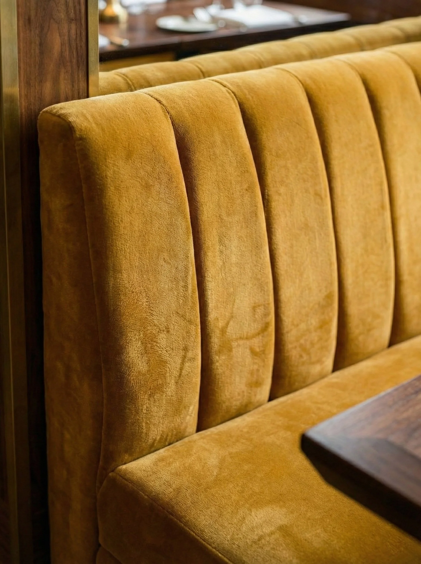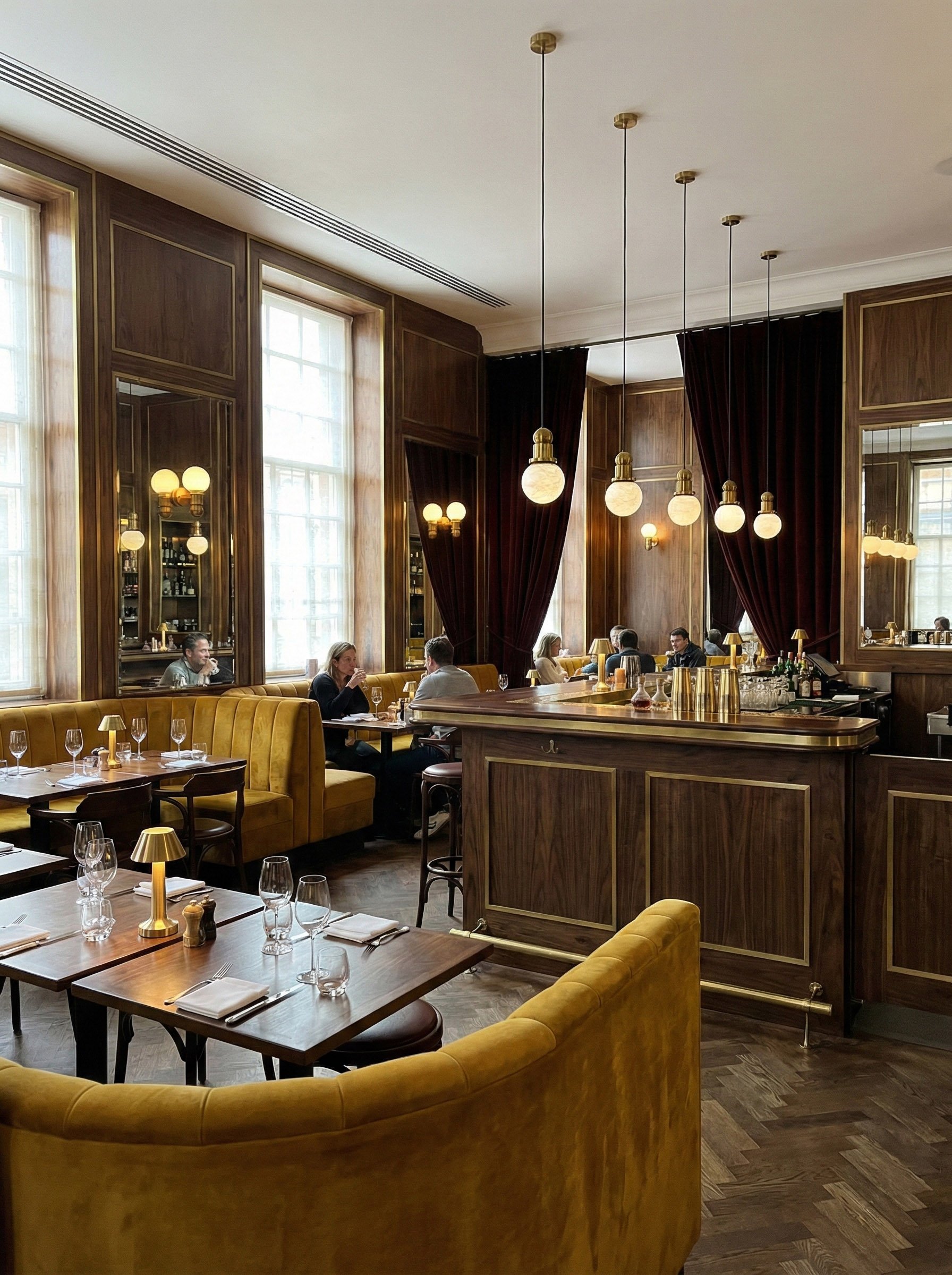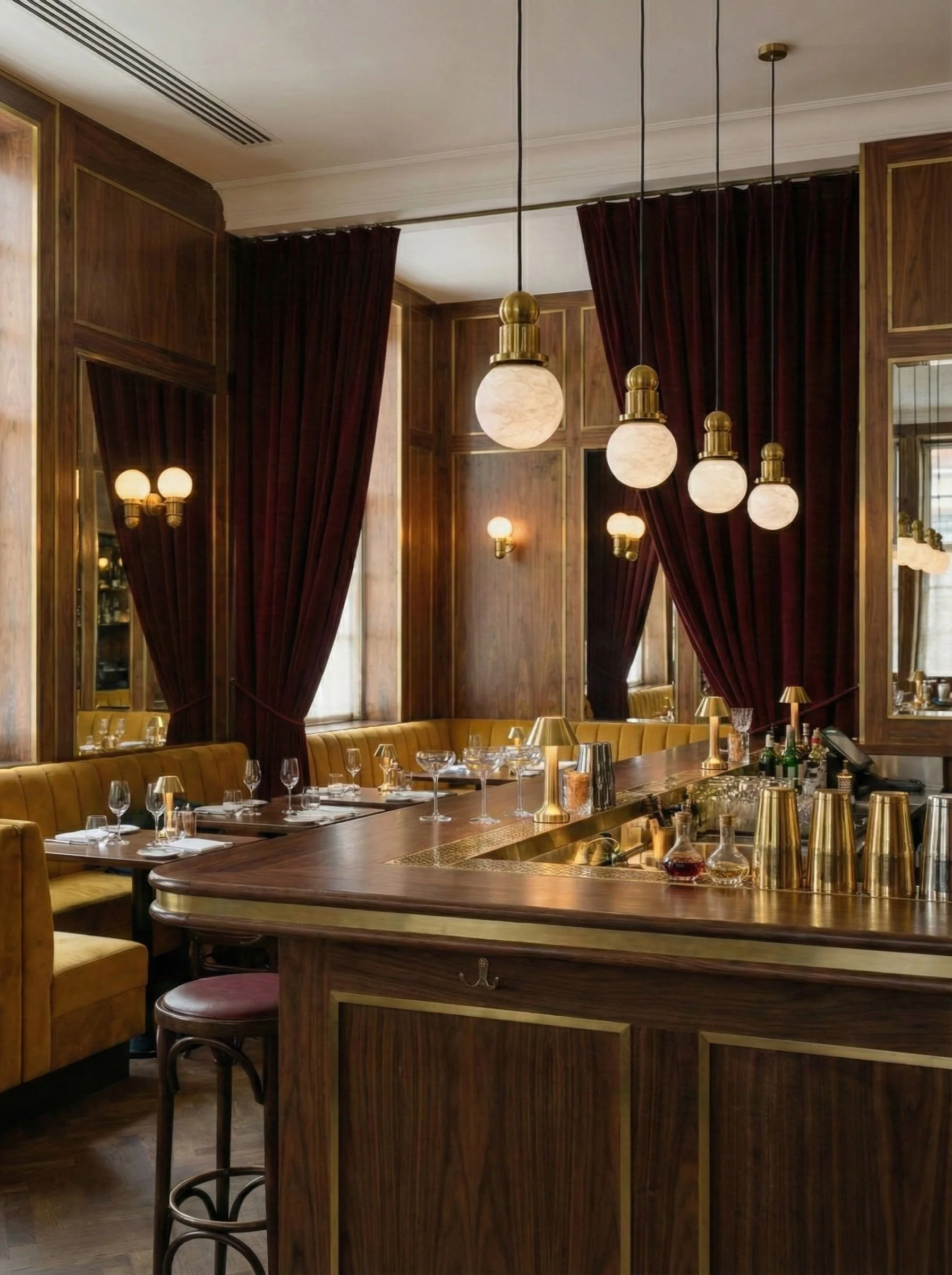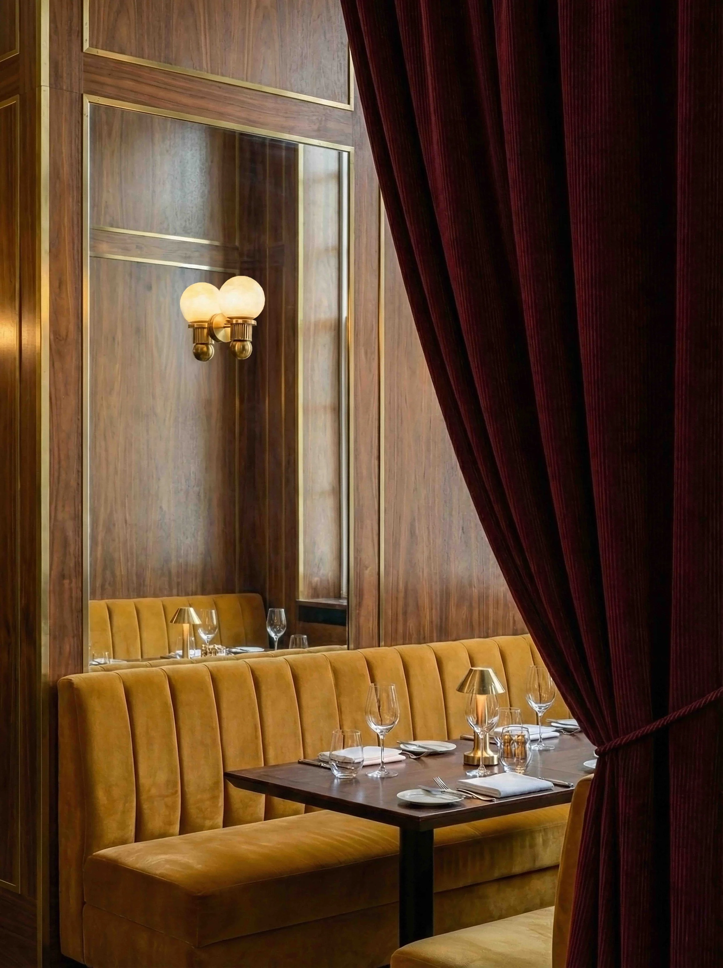 L’espace se déploie comme un hommage aux matières nobles et aux accords chromatiques profonds. Les rideaux bordeaux, au tombé lourd et majestueux, encadrent le lieu d'une élégance théâtrale, tandis que les banquettes en velours jaune curry apportent une lumière solaire et une douceur tactile inédite. Ce dialogue de couleurs primaires, revisitées avec sophistication, crée une ambiance à la fois énergique et enveloppante.