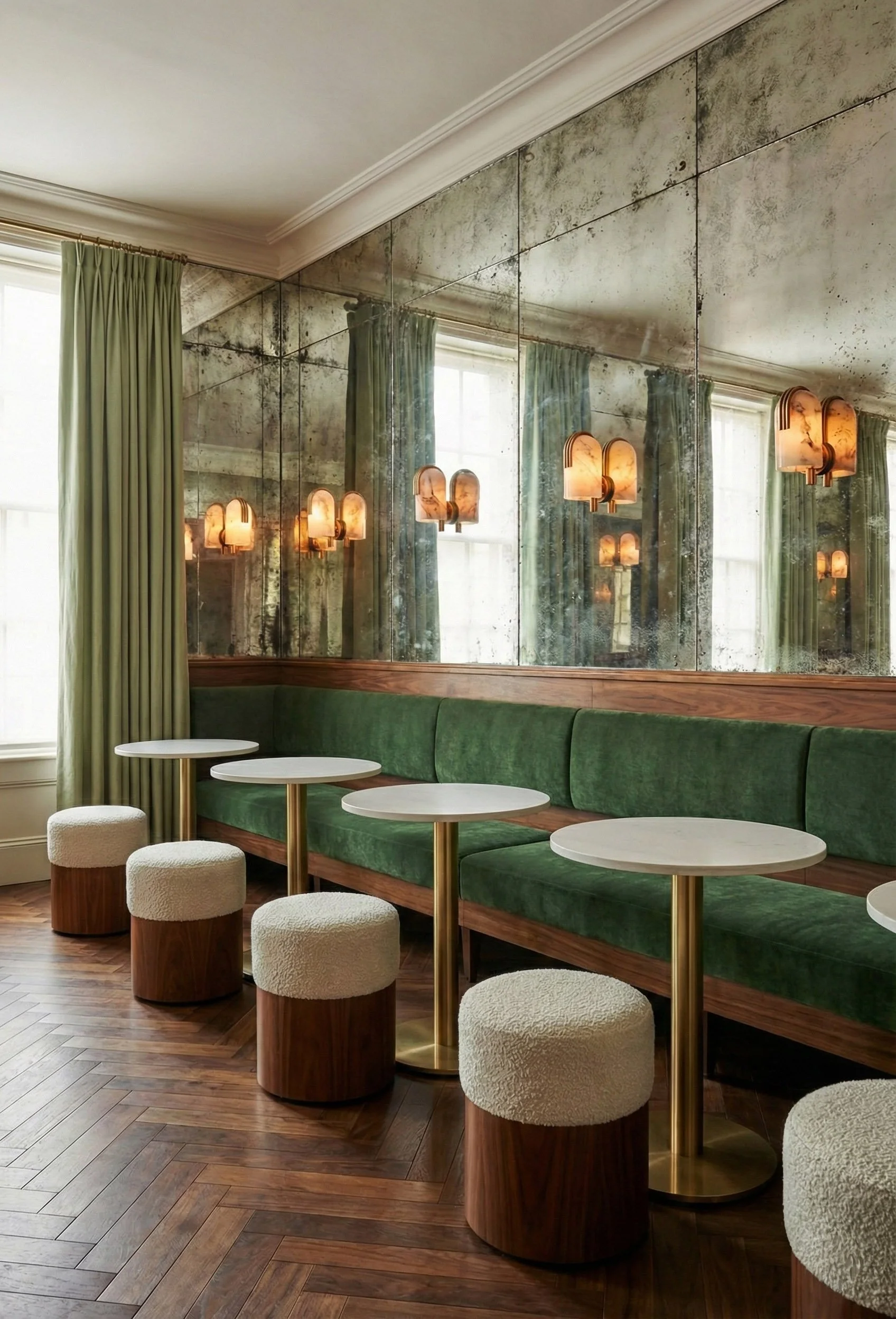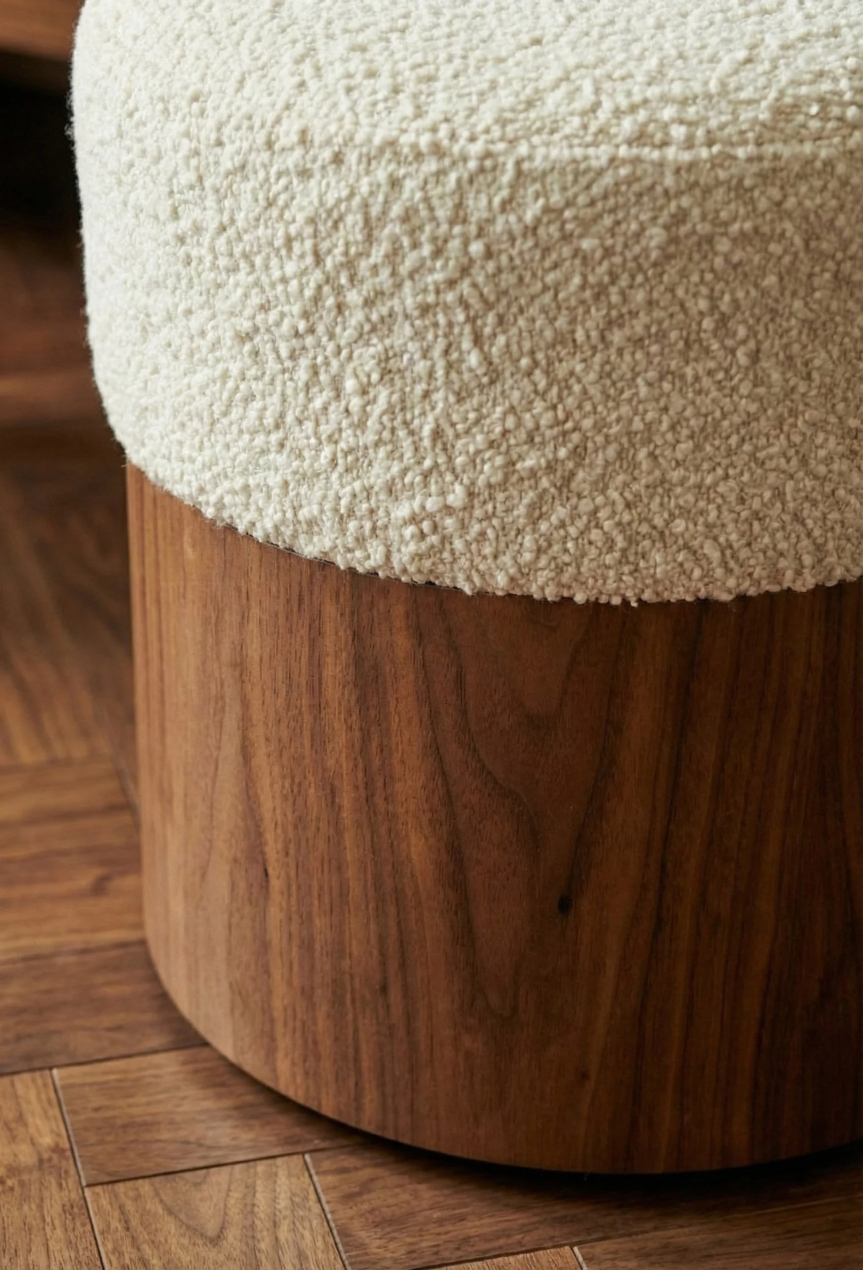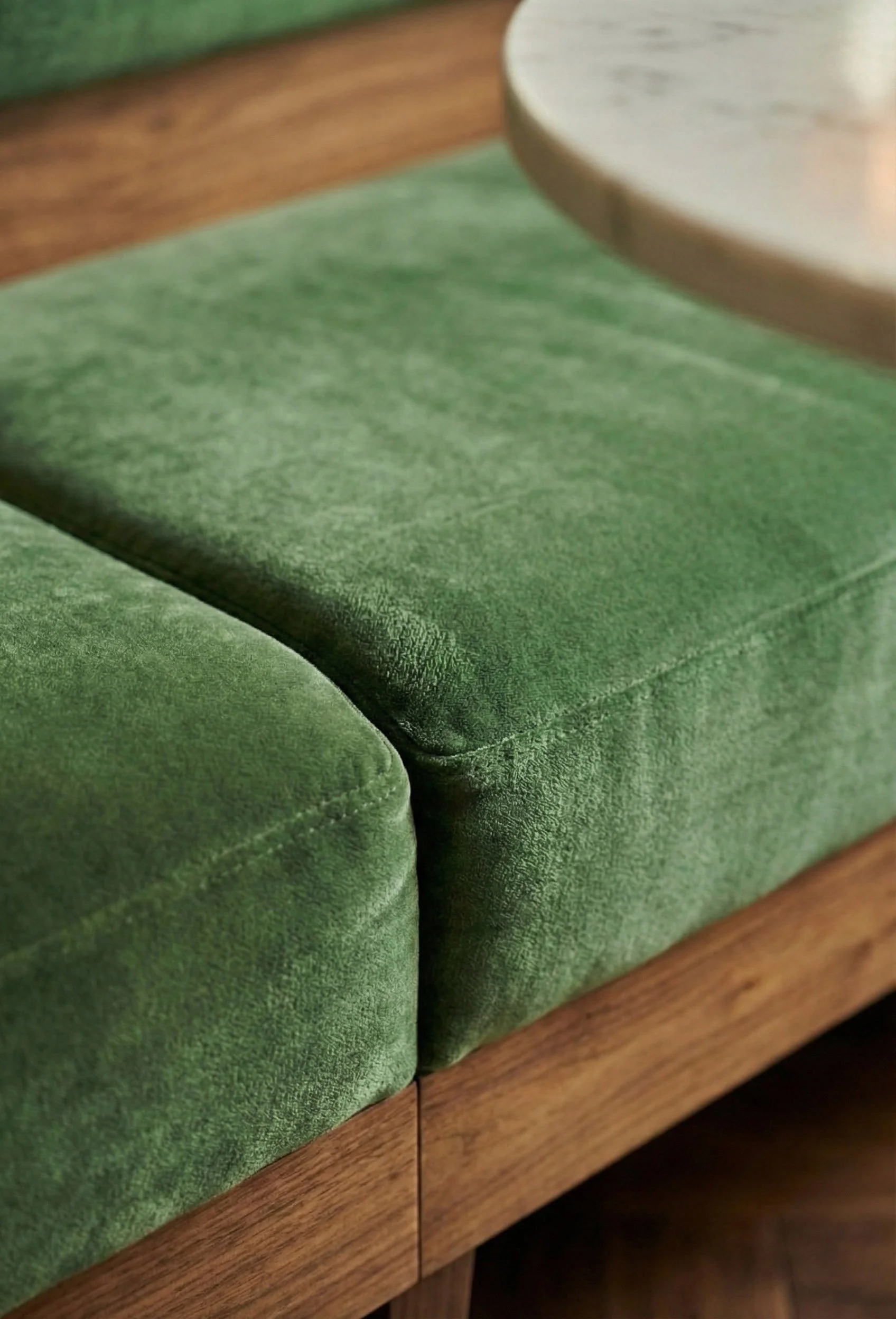 L’espace s’articule autour d’un dialogue chromatique et tactile saisissant. Le velours vert forêt, profond et mystérieux, enveloppe les assises de son luxe feutré, tandis que le tissu bouclette beige apporte une douceur nuageuse et une clarté organique. Ce jardin de textures est ancré par la noblesse du merisier, dont le grain chaud et les teintes rousses habillent le lieu d'une élégance résidentielle et intemporelle.