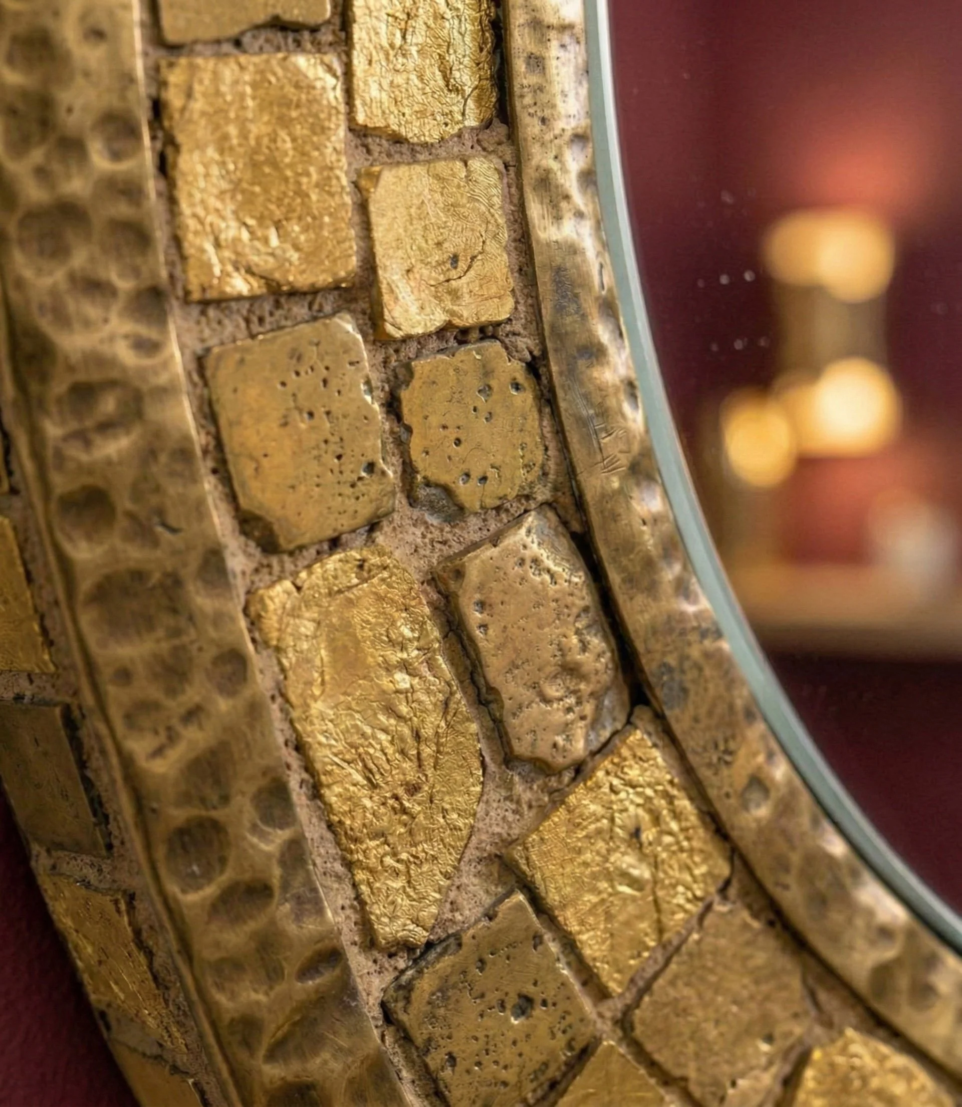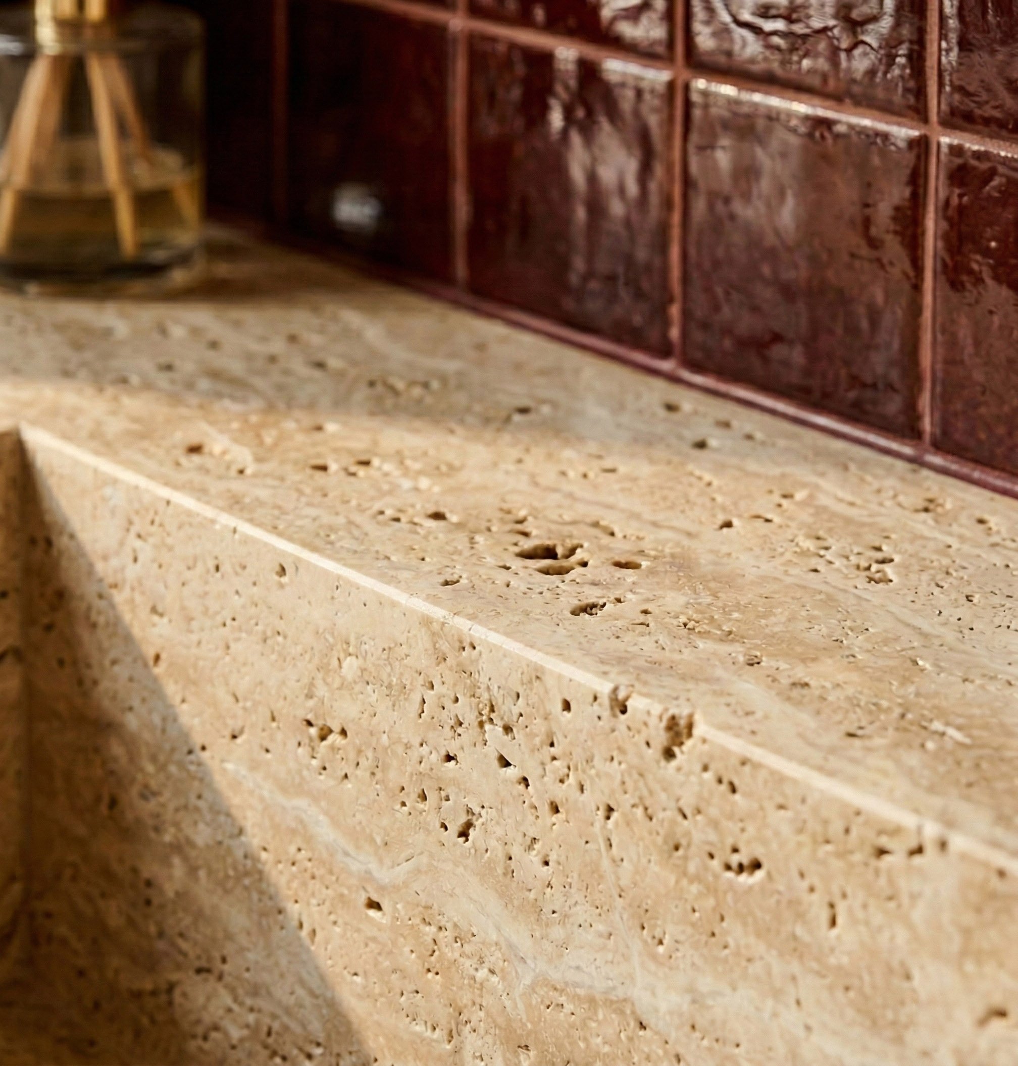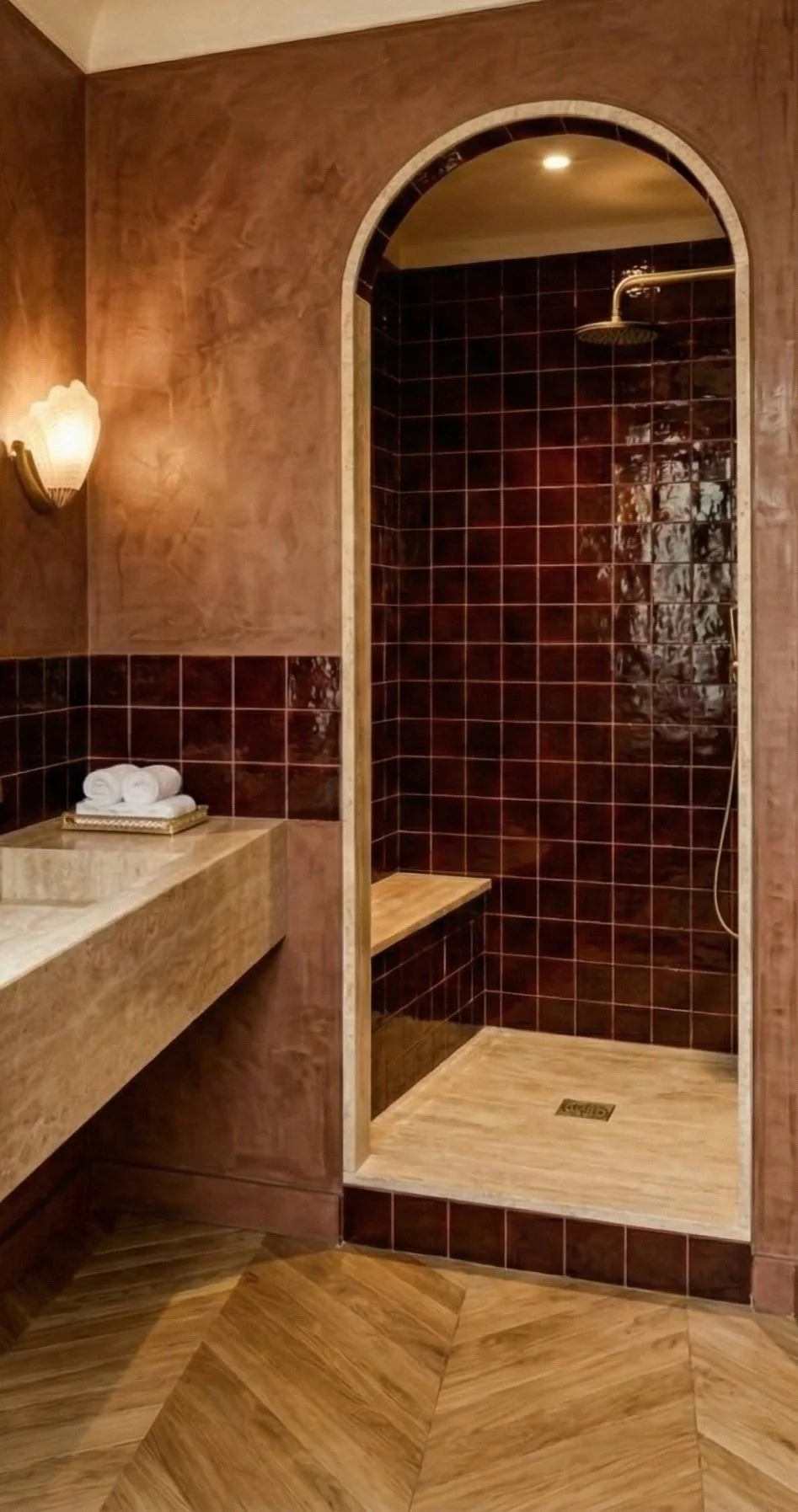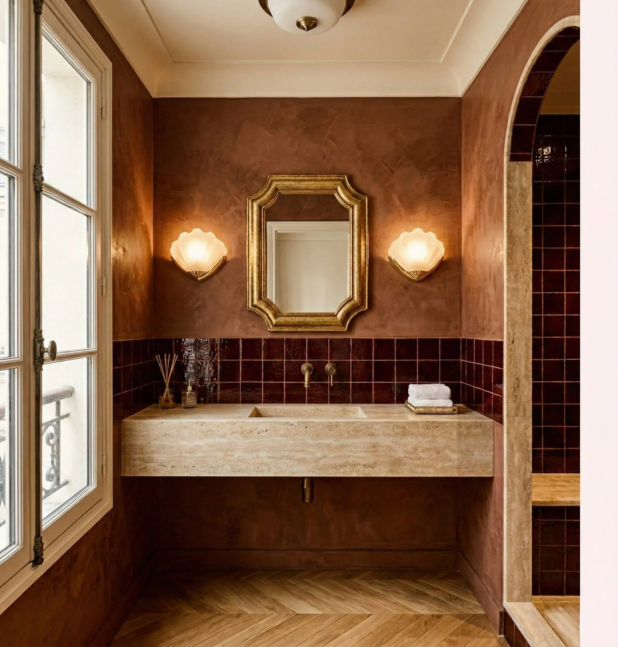 Puis, comme une ponctuation audacieuse, le regard s'échappe vers l'intime. L'entrée et les salles d'eau surgissent comme des bijoux saturés. On y entre comme dans un cabinet de curiosités contemporain : les couleurs y sont denses, les motifs se superposent, les textures s'accumulent avec une générosité assumée. C'est le triomphe du petit, du précieux, du chargé.