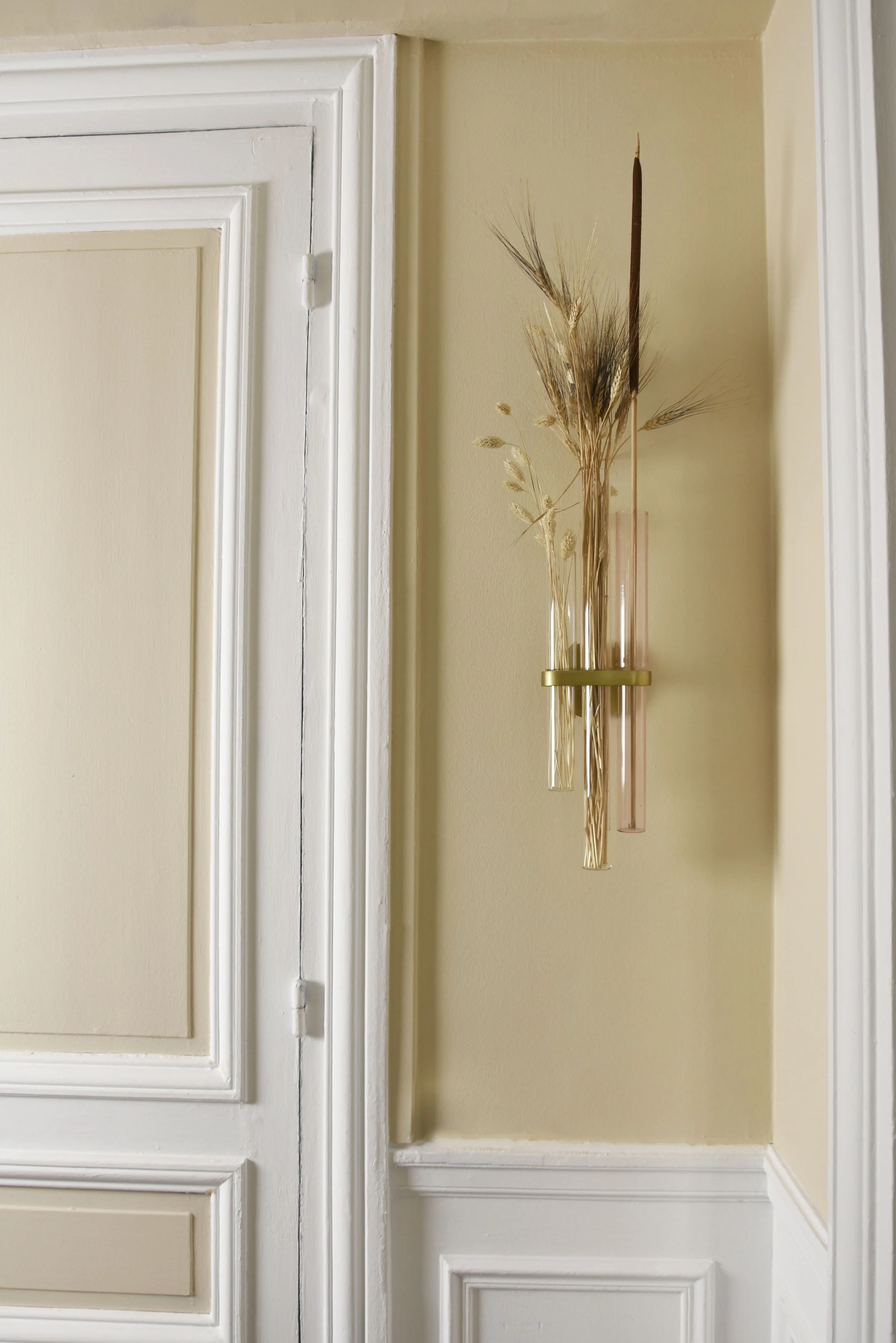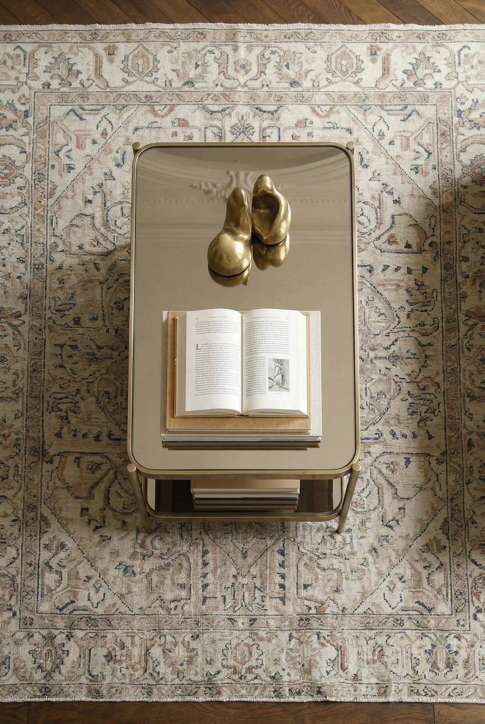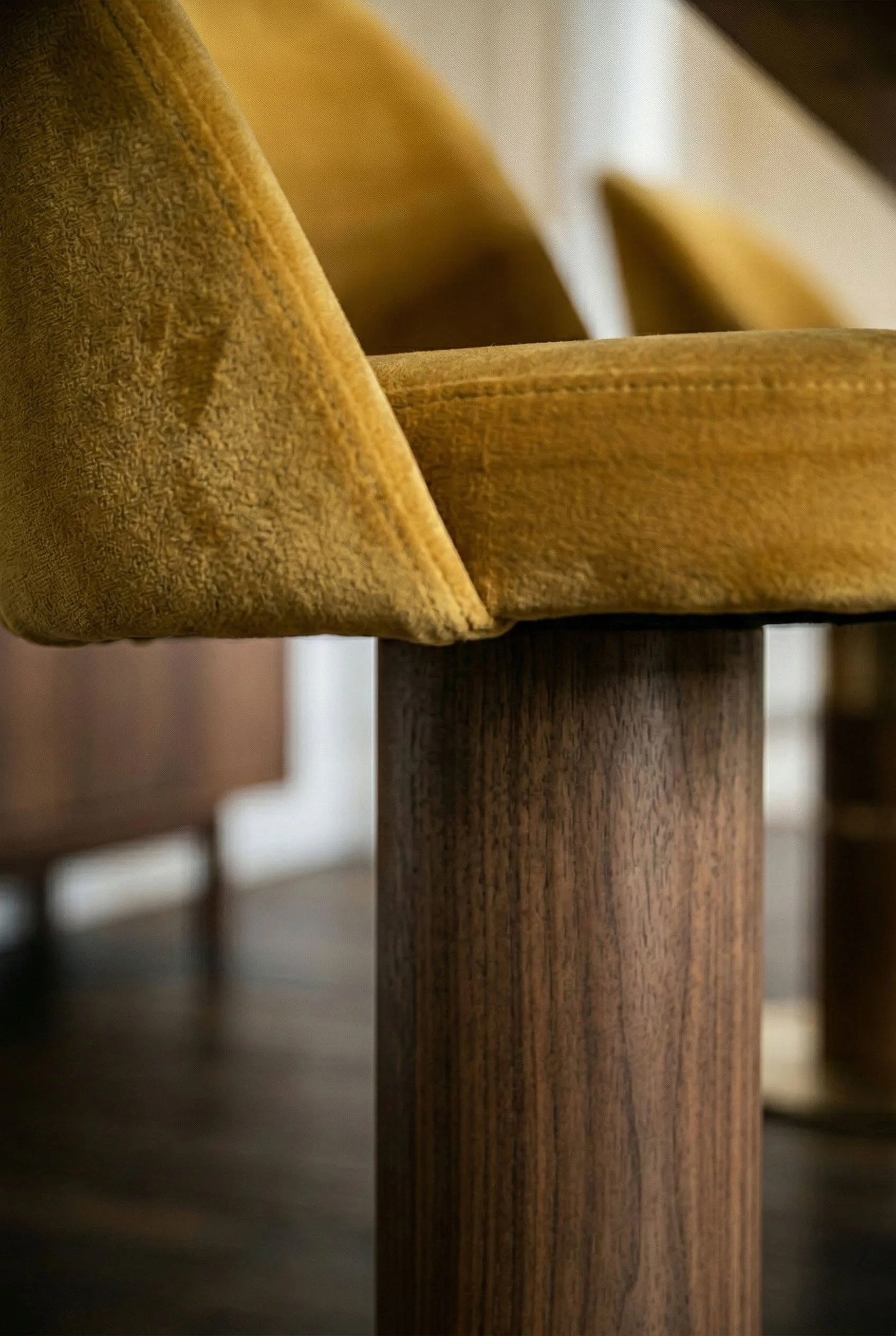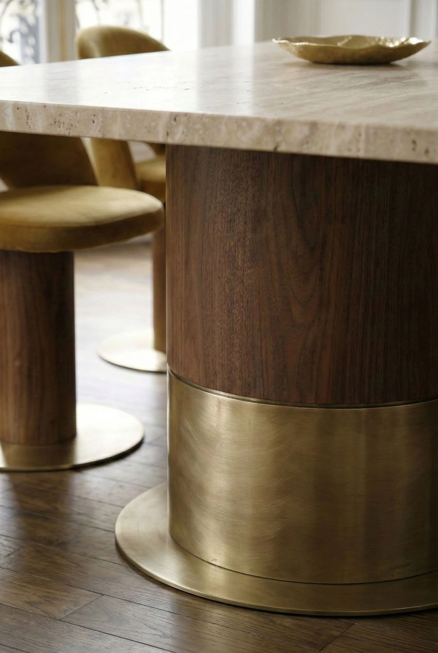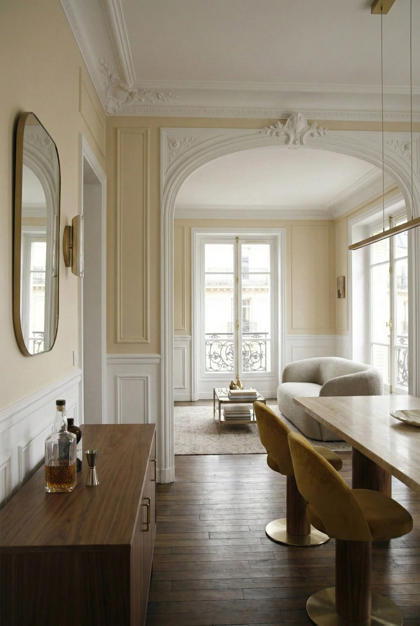 L’animation du lieu naît des détails qui ponctuent ce décor organique. Le bois apporte sa force tranquille et ses veines naturelles, tandis que le laiton, par touches solaires, vient souligner les lignes haussmanniennes comme un trait d'or sur un parchemin.