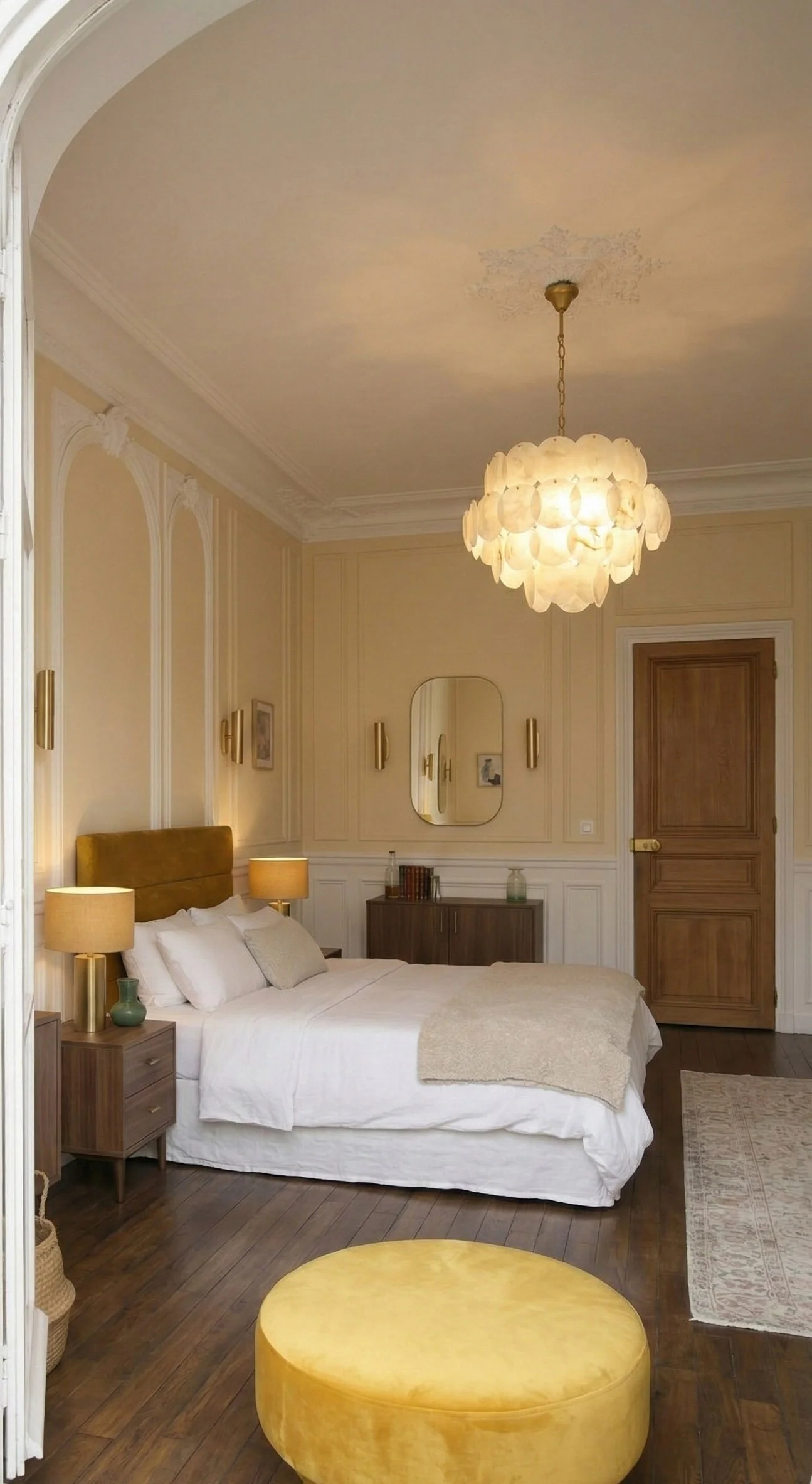 Dans ce volume baigné d'une clarté poudrée, c'est la matière qui prend la parole. Le beige n'est pas un silence, c'est une vibration : il se fait velours sur un siège, trame serrée sur un rideau, ou grain délicat sur les murs.
